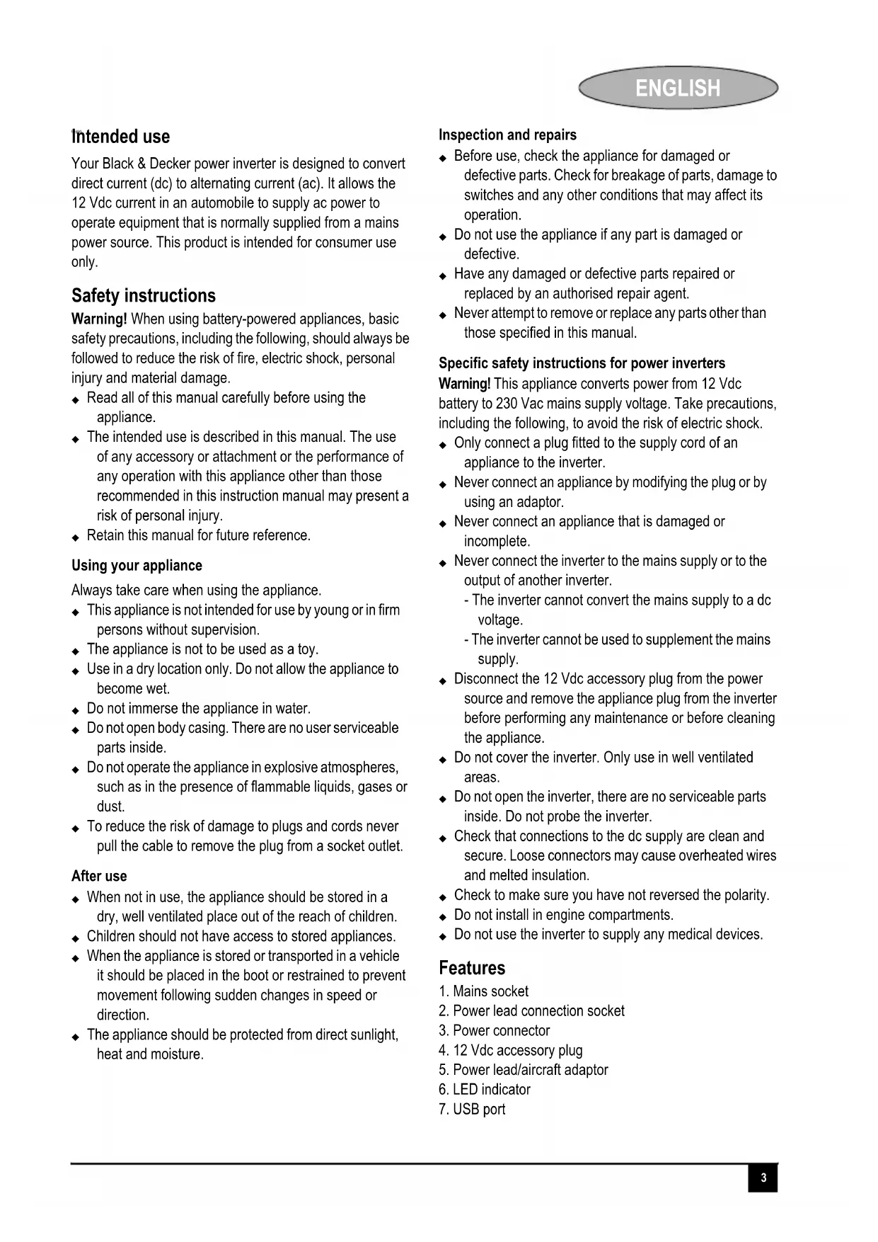Your Black & Decker power inverter is designed to convert direct current (dc) to alternating current (ac). It allows the 12 Vdc current in an automobile to supply ac power to operate equipment that is normally supplied from a mains power source. This product is intended for consumer use only.