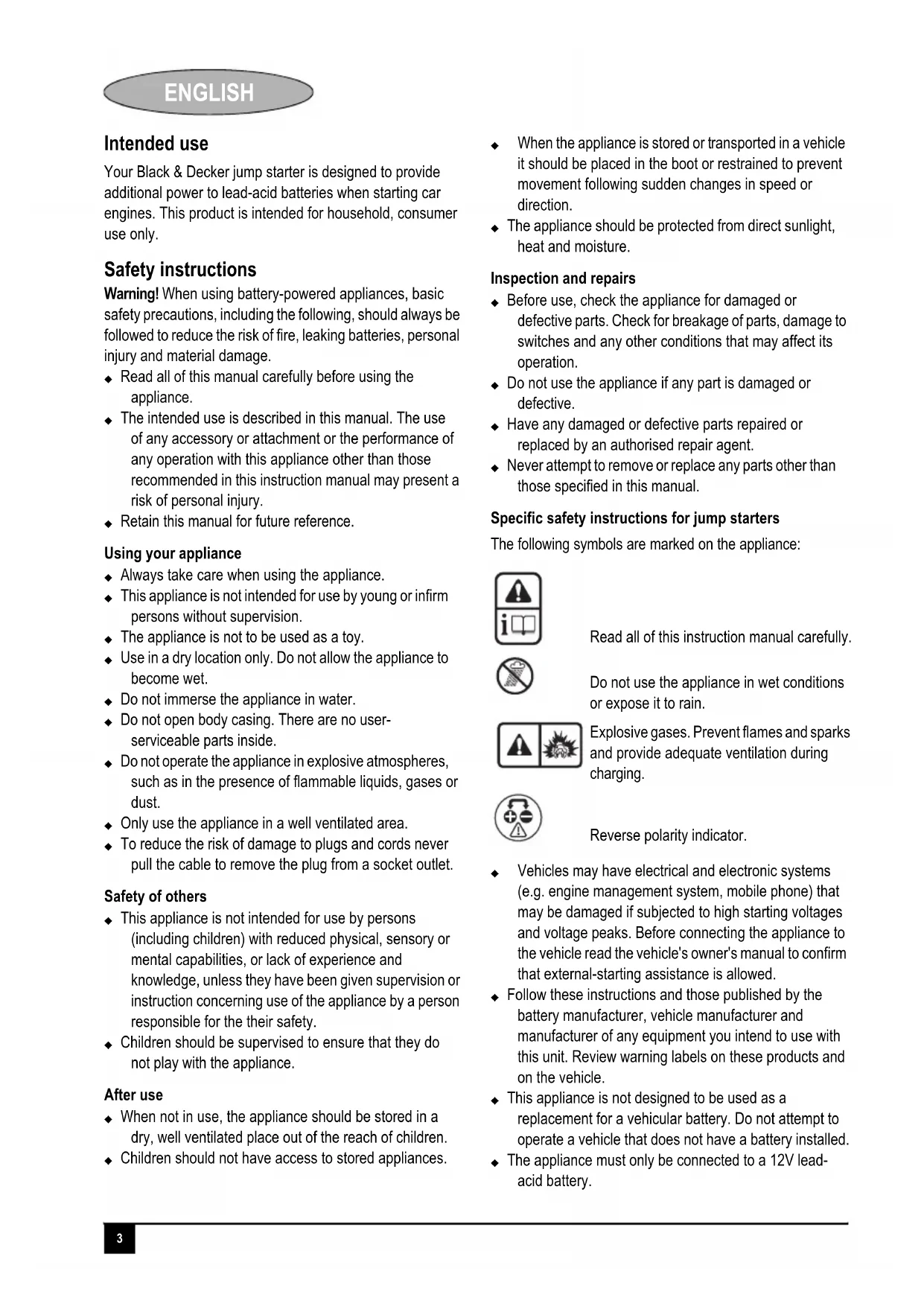 Your Black & Decker jump starter is designed to provide additional power to lead-acid batteries when starting car engines. This product is intended for household, consumer use only.