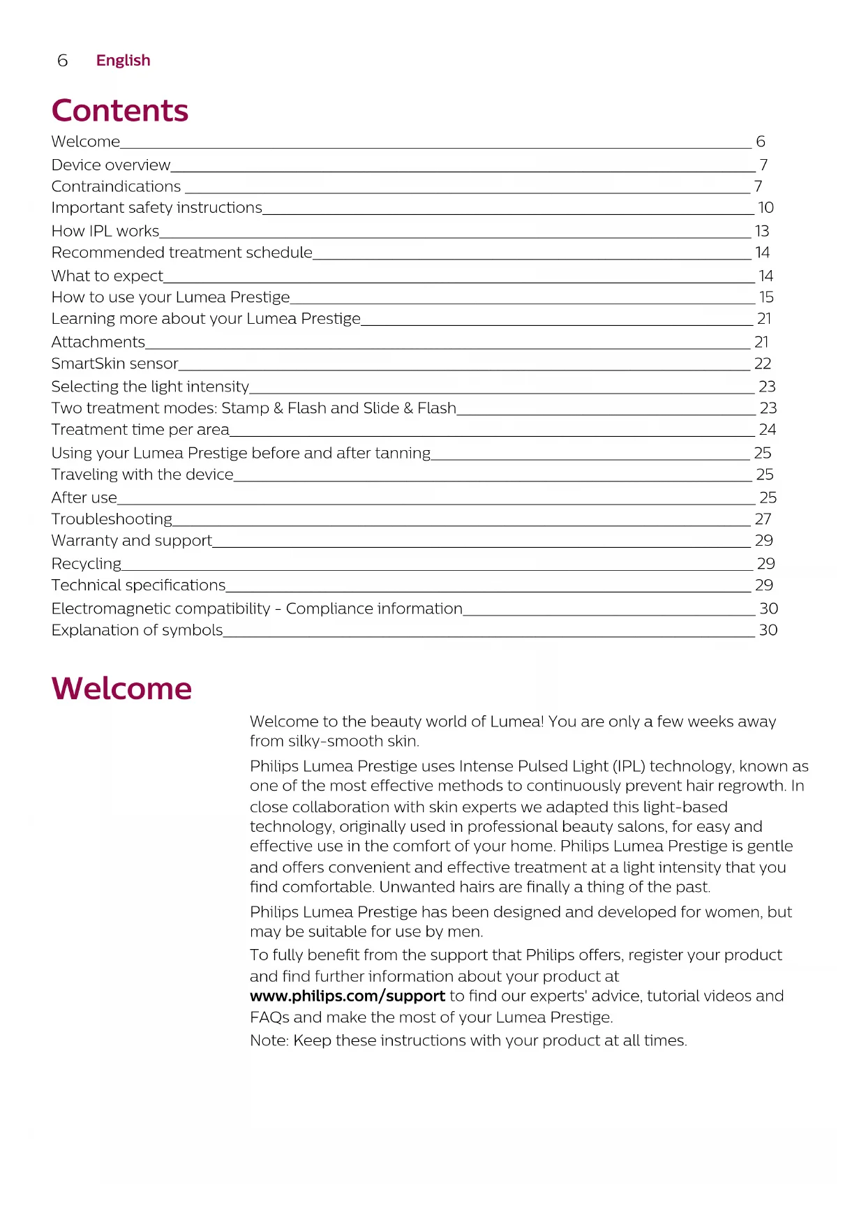 English Contents Welcome_______________________________________________________________________________________________ 6 Device overview________________________________________________________________________________________ 7 Contraindications _____________________________________________________________________________________ 7 Important safety instructions__________________________________________________________________________ 10 How IPL works_________________________________________________________________________________________ 13 Recommended treatment schedule__________________________________________________________________ 14 What to expect_________________________________________________________________________________________ 14 How to use your Lumea Prestige______________________________________________________________________ 15 Learning more about your Lumea Prestige___________________________________________________________ 21 Attachments___________________________________________________________________________________________ 21 SmartSkin sensor______________________________________________________________________________________ 22 Selecting the light intensity____________________________________________________________________________ 23 Two treatment modes: Stamp & Flash and Slide & Flash_____________________________________________ 23 Treatment time per area_______________________________________________________________________________ 24 Using your Lumea Prestige before and after tanning________________________________________________ 25 Traveling with the device______________________________________________________________________________ 25 After use________________________________________________________________________________________________ 25 Troubleshooting_______________________________________________________________________________________ 27 Warranty and support_________________________________________________________________________________ 29 Recycling_______________________________________________________________________________________________ 29 Technical specifications_______________________________________________________________________________ 29 Electromagnetic compatibility - Compliance information____________________________________________ 30 Explanation of symbols________________________________________________________________________________ 30 Welcome Welcome to the beauty world of Lumea! You are only a few weeks away from silky-smooth skin. Philips Lumea Prestige uses Intense Pulsed Light (IPL) technology, known as one of the most effective methods to continuously prevent hair regrowth. In close collaboration with skin experts we adapted this light-based technology, originally used in professional beauty salons, for easy and effective use in the comfort of your home. Philips Lumea Prestige is gentle and offers convenient and effective treatment at a light intensity that you find comfortable. Unwanted hairs are finally a thing of the past. Philips Lumea Prestige has been designed and developed for women, but may be suitable for use by men. To fully benefit from the support that Philips offers, register your product and find further information about your product at www.philips.com/support to find our experts' advice, tutorial videos and FAQs and make the most of your Lumea Prestige. Note: Keep these instructions with your product at all times.7 English