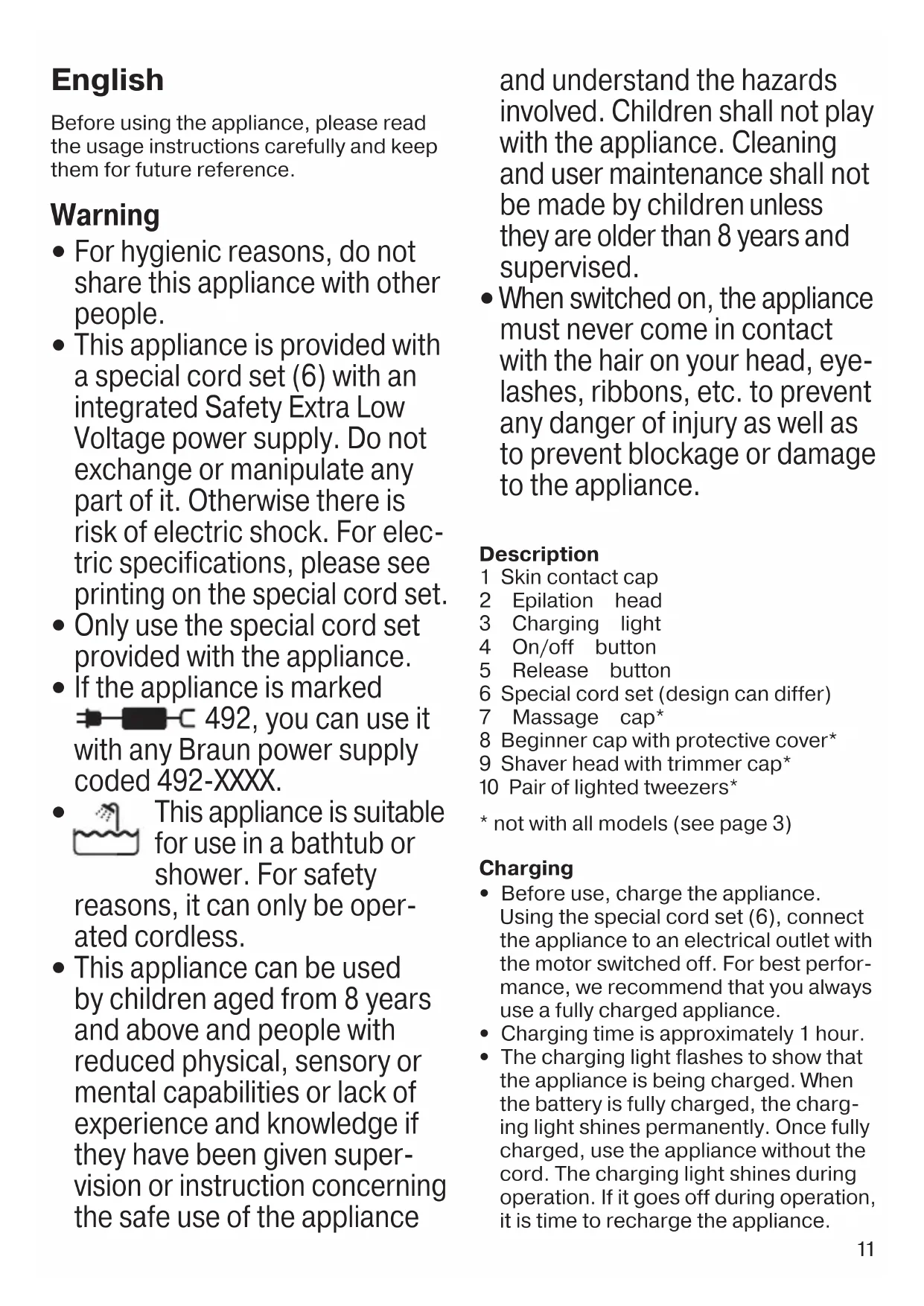 When switched on, the appliance must never come in contact with the hair on your head, eye- lashes, ribbons, etc. to prevent any danger of injury as well as to prevent blockage or damage to the appliance. Description 1 Skin contact cap 2 Epilation head 3 Charging light 4 On/off button 5 Release button 6 Special cord set (design can differ) 7 Massage cap* 8 Beginner cap with protective cover* 9 Shaver head with trimmer cap* 0 Pair of lighted tweezers*