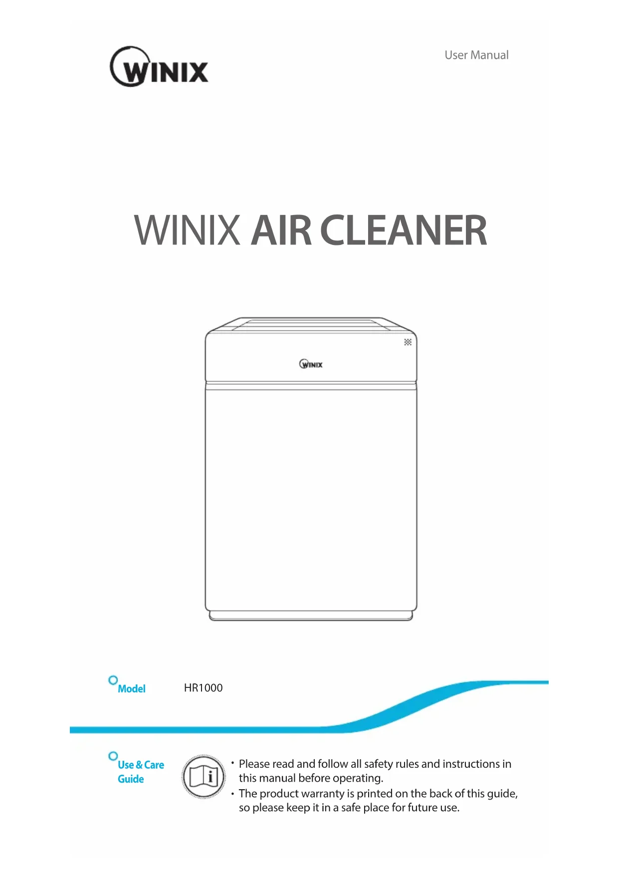 The product warranty is printed on the back of this guide, so please keep it in a safe place for future use. Model Use & Care Guide2 English HR 1000 CONTENTS Set Up Where to use 5 Installing the filters 6 Safety Instructions Safety and Cautions 8 Operation Initial Operation 9 Modes of Operation 10 Features and Settings 11 WINIX SMART Set Up 13 Care and Maintenance Filter Care 14 Smart Sensor Care 18 Cleaning Care 19 Troubleshooting Frequently Asked Questions 20 Unit Specifications 22 Product Warranty 24 5-Stage Air Purification 3 Controls 4 This product is suitable for 220 ~ 240V only. French 25 Spanish 49 German 73 Italian 97 Nederlands 1213 English HR 1000 PlasmaWave® 4 Anti-microbial coated 3 True HEPA filter 2 (CD) Coated Deodorization Carbon filter 1 Pre-filter