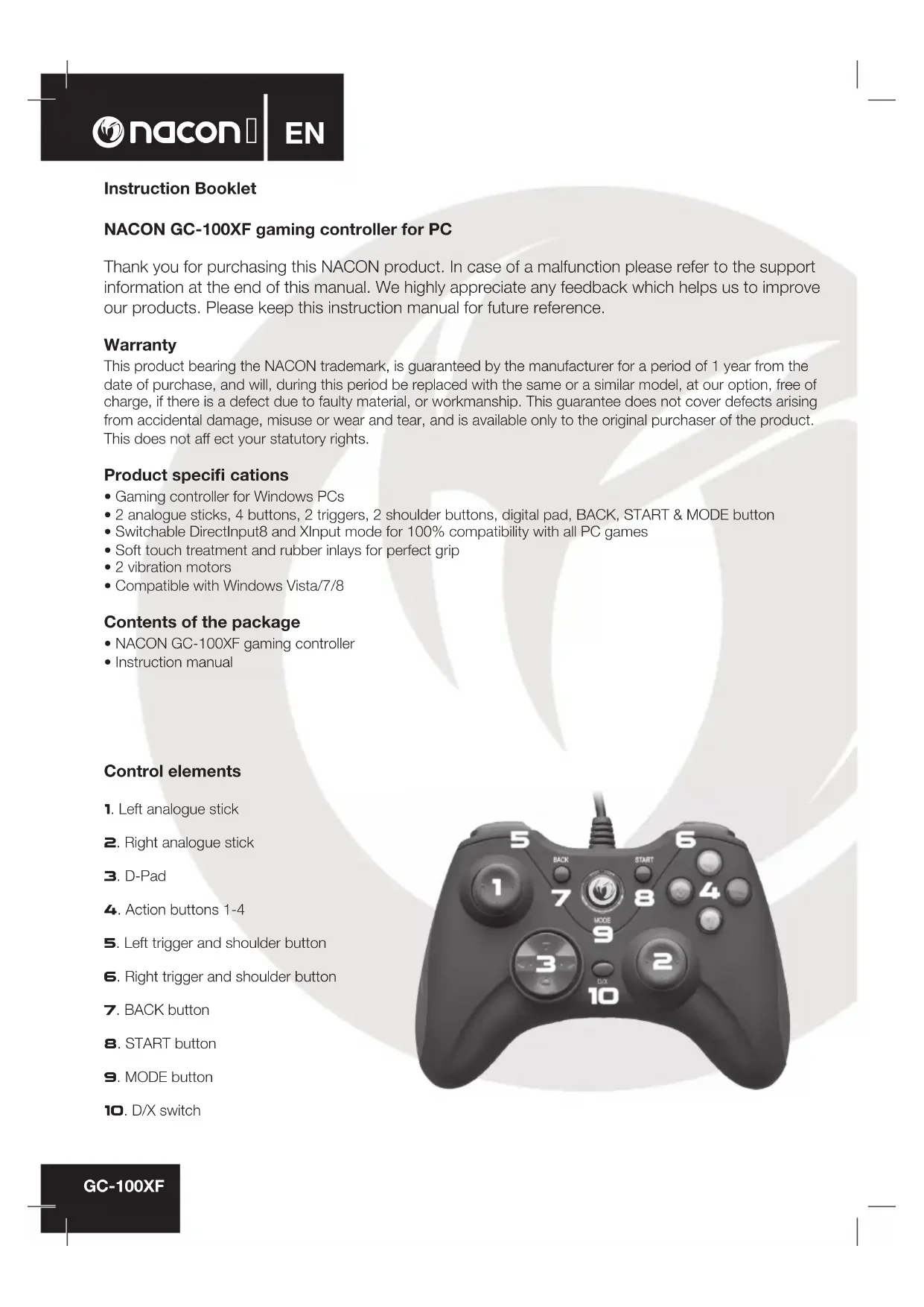 GC-100XF Instruction Booklet NACON GC-100XF gaming controller for PC Thank you for purchasing this NACON product. In case of a malfunction please refer to the support information at the end of this manual. We highly appreciate any feedback which helps us to improve our products. Please keep this instruction manual for future reference. Warranty This product bearing the NACON trademark, is guaranteed by the manufacturer for a period of 1 year from the date of purchase, and will, during this period be replaced with the same or a similar model, at our option, free of charge, if there is a defect due to faulty material, or workmanship. This guarantee does not cover defects arising from accidental damage, misuse or wear and tear, and is available only to the original purchaser of the product. This does not aff ect your statutory rights. Product specifi cations