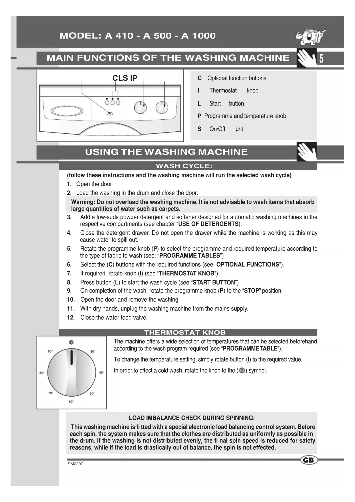 STOP INDICATOR LIGHT: The indicator light is off when the programme knob is in the STOP position. The indicator light in permanently lit during the execution of the programme. The indicator light fl ashes slowly when the programme has fi nished.PROGRAMME KNOB “STOP”: OPTIONAL FUNCTIONS Press this button to execute a short wash of maximum temperature 40°C and ap- proximately 10 minutes. duration This function can only be used on the “COTTON”, “SYNTHETICS” and “DAILY” programmes. N.B. When this option is used, the detergent must also be added to the appropriate pre-wash compartment.PRE-WASH:The stop function resets the washing machine. If, for any reason, you want to change the wash programme or add more washing to the load during the wash cycle, simply place the programme knob in position “STOP”. Then re-position the knob on the new programme and press the “START” button.Warning!! Only use this function if strictly necessary and then only if the program to reset has been running for less than 3 minutes. Before opening the door after a reset, wait 2 minutes for the locking mechanism to release.Press this button to start the wash cycle.NO SPIN:When this button is pressed, the washing machine will effect a wash cycle without spinning.N.B. The use of this function depends on the type of programme selected. Consequently, if the wash programme does not include this function, the button cannot be enabled (see PROGRAMME TABLE). START BUTTON:7 SM2207 PROGRAMME TABLES