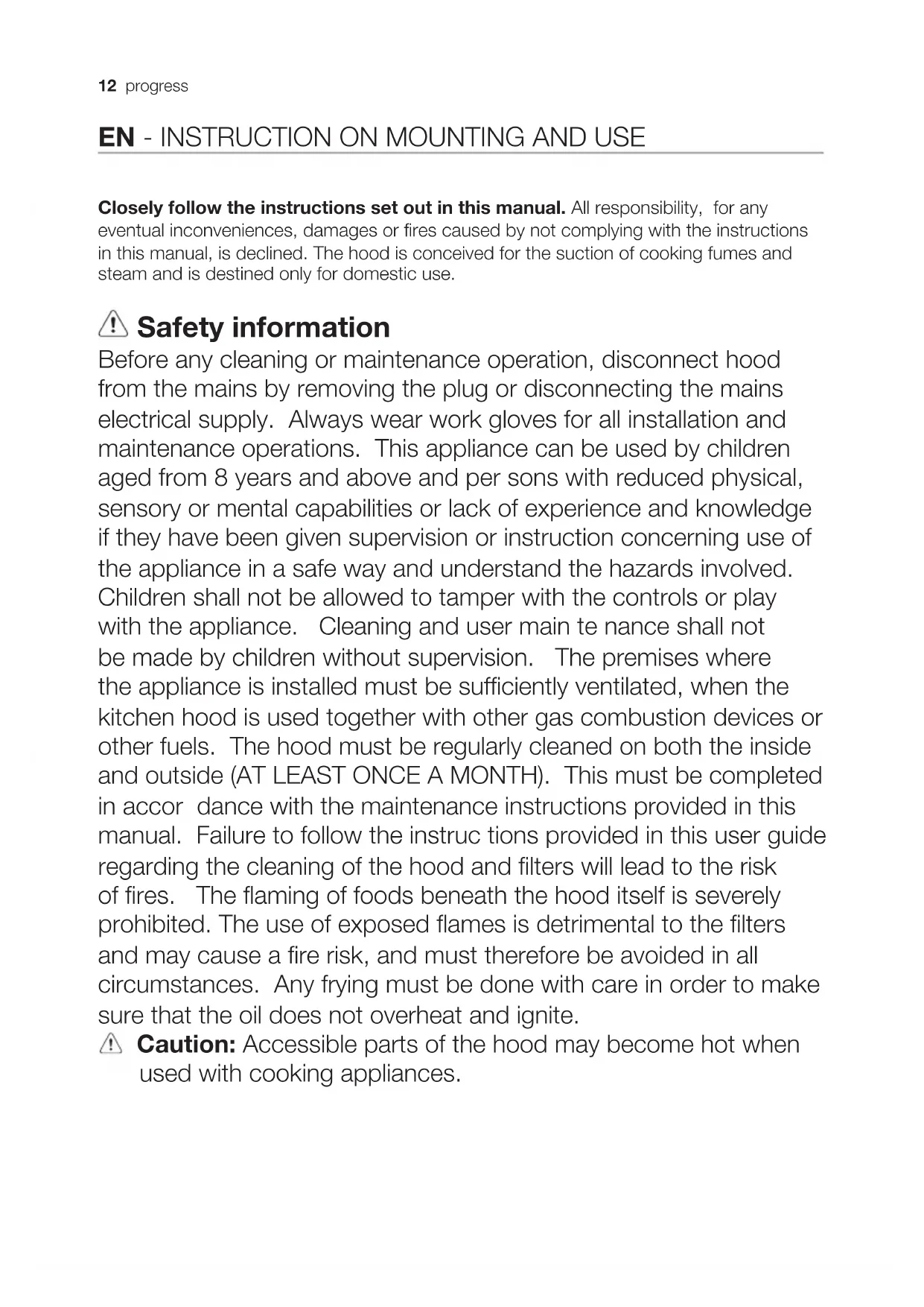 E14 Tensione (V) Dimensione (mm) 220-240 35x102 (Diametro x Lunghezza) Codice ILCOS D (in accordo a IEC 61231) DRBB/C-3-220-240-E14-35/10212 progress EN - INSTRUCTION ON MOUNTING AND USE Closely follow the instructions set out in this manual. All responsibility, for any eventual inconveniences, damages or fires caused by not complying with the instructions in this manual, is declined. The hood is conceived for the suction of cooking fumes and steam and is destined only for domestic use. Safety information Before any cleaning or maintenance operation, disconnect hood from the mains by removing the plug or disconnecting the mains electrical supply. Always wear work gloves for all installation and maintenance operations. This appliance can be used by children aged from 8 years and above and per sons with reduced physical, sensory or mental capabilities or lack of experience and knowledge if they have been given supervision or instruction concerning use of the appliance in a safe way and understand the hazards involved. Children shall not be allowed to tamper with the controls or play with the appliance. Cleaning and user main te nance shall not be made by children without supervision. The premises where the appliance is installed must be sufficiently ventilated, when the kitchen hood is used together with other gas combustion devices or other fuels. The hood must be regularly cleaned on both the inside and outside (AT LEAST ONCE A MONTH). This must be completed in accor dance with the maintenance instructions provided in this manual. Failure to follow the instruc tions provided in this user guide regarding the cleaning of the hood and filters will lead to the risk of fires. The flaming of foods beneath the hood itself is severely prohibited. The use of exposed flames is detrimental to the filters and may cause a fire risk, and must therefore be avoided in all circumstances. Any frying must be done with care in order to make sure that the oil does not overheat and ignite. Caution: Accessible parts of the hood may become hot when used with cooking appliances.progress 13 Safety instructions For lamp replacement use only lamp type indicated in the Maintenance/Replacing lamps section of this manual. Warning! Do not connect the appliance to the mains until the installation is fully complete. With regards to the technical and safety measures to be adopted for fume discharging it is important to closely follow the regulations provided by the local authorities. The ducting system for this appliance must not be connected to any existing ventilation system which is being used for any other purpose such as discharging exhaust fumes from appliances burning gas or other fuels. Do not use or leave the hood without the lamp correctly mounted due to the possible risk of electric shocks. Never use the hood without effectively mounted grids. The hood must NEVER be used as a support surface unless specifically indicated. Use only the fixing screws supplied with the product for installation or, if not supplied, purchase the correct screws type. Use the correct length for the screws which are identified in the Installation Guide. In case of doubt, consult an authorised service assistance centre or similar qualified person. Warning! Failure to install the screws or fixing device in accordance with these instructions may result in electrical hazards. Environment concerns Recycle the materials with the symbol . Put the packaging in applicable containers to recycle it. Help protect the environment and human health and to recycle waste of electrical and electronic appliances. Do not dispose appliances marked with the symbol with the household waste. Return the product to your local recycling facility or contact your municipal office department for household waste or the shop where you purchased this product. Use The hood is designed to be used either for exhausting or filter version . Installation The mains power supply must correspond to the rating indicated on the plate situated inside the hood. If provided with a plug connect the hood to a socket in compliance with current regulations and positioned in an accessible area, after installation. If it not fitted with a plug (direct mains connection) or if the plug is not located in an accessible area, after installation, apply a double pole switch in accordance with standards which assures the complete disconnection of the mains under conditions relating to overcurrent category III in accordance with installation instructions. Warning! Before re-connecting the hood circuit to the mains supply and checking the efficient function, always check that the mains cable is correctly assembled.14 progress Very heavy product; hood handling and installation must be carried out by at least two persons. The minimum distance between the supporting surface for the cooking equipment on the hob and the lowest part of the range hood must be not less than 50cm from electric cookers and 65cm from gas or mixed cookers. If the instructions for installation for the gas hob specify a greater distance, this must be adhered to. Operation The hood is fitted with a control panel with aspiration speed selection control and a light switch to control cooking area lights.