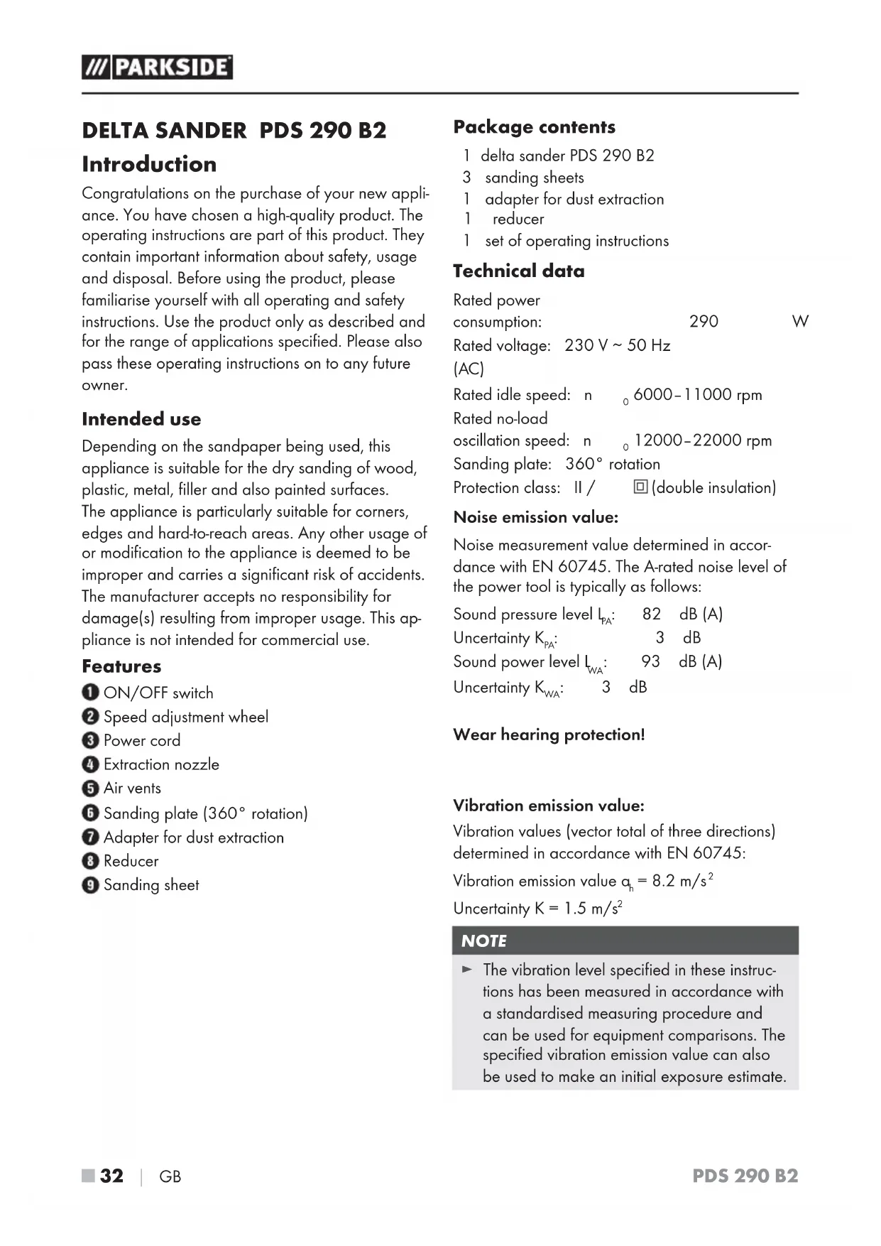 Introduction Congratulations on the purchase of your new appli- ance. You have chosen a high-quality product. The operating instructions are part of this product. They contain important information about safety, usage and disposal. Before using the product, please familiarise yourself with all operating and safety instructions. Use the product only as described and for the range of applications specified. Please also pass these operating instructions on to any future owner. Intended use Depending on the sandpaper being used, this appliance is suitable for the dry sanding of wood, plastic, metal, filler and also painted surfaces. The appliance is particularly suitable for corners, edges and hard-to-reach areas. Any other usage of or modification to the appliance is deemed to be improper and carries a significant risk of accidents. The manufacturer accepts no responsibility for damage(s) resulting from improper usage. This ap- pliance is not intended for commercial use. Features ON/OFF switch Speed adjustment wheel Power cord Extraction nozzle Air vents Sanding plate (360° rotation) Adapter for dust extraction Reducer Sanding sheet Package contents 1 delta sander PDS 290 B2 3 sanding sheets 1 adapter for dust extraction 1 reducer 1 set of operating instructions Technical data Rated power consumption: 290 W Rated voltage: 230 V ∼ 50 Hz (AC) Rated idle speed: n