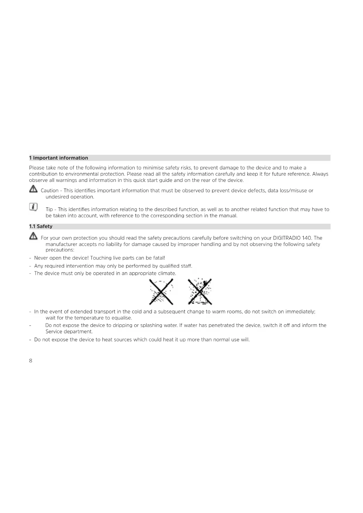 For your own protection you should read the safety precautions carefully before switching on your DIGITRADIO 140. The manufacturer accepts no liability for damage caused by improper handling and by not observing the following safety precautions: - Never open the device! Touching live parts can be fatal! - Any required intervention may only be performed by qualified sta. - The device must only be operated in an appropriate climate. - In the event of extended transport in the cold and a subsequent change to warm rooms, do not switch on immediately; wait for the temperature to equalise. - Do not expose the device to dripping or splashing water. If water has penetrated the device, switch it o and inform the Service department. - Do not expose the device to heat sources which could heat it up more than normal use will.9