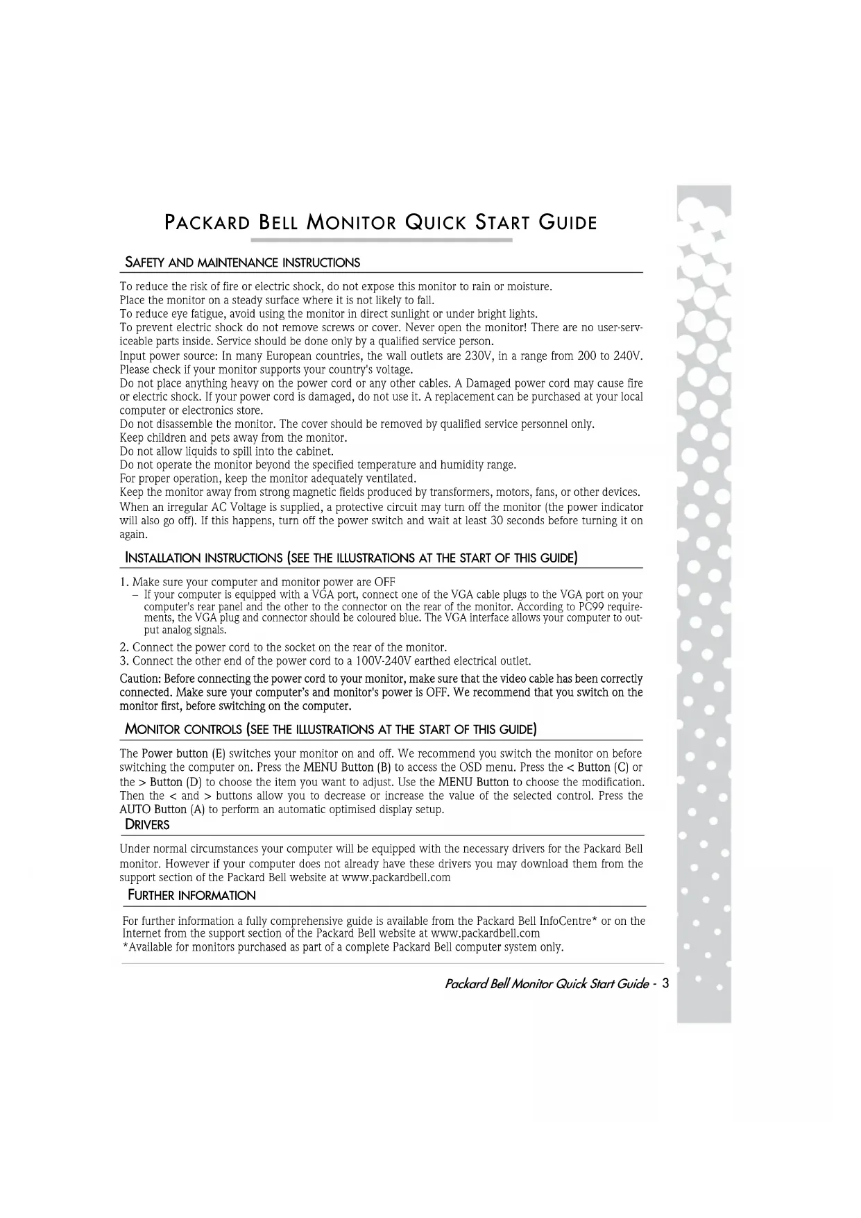 − If your computer is equipped with a VGA port, connect one of the VGA cable plugs to the VGA port on your computer's rear panel and the other to the connector on the rear of the monitor. According to PC99 require- ments, the VGA plug and connector should be coloured blue. The VGA interface allows your computer to out- put analog signals. 2. Connect the power cord to the socket on the rear of the monitor.3. Connect the other end of the power cord to a 100V-240V earthed electrical outlet. Caution: Before connecting the power cord to your monitor, make sure that the video cable has been correctly connected. Make sure your computer’s and monitor's power is OFF. We recommend that you switch on the monitor first, before switching on the computer. MONITOR CONTROLS (SEE THE ILLUSTRATIONS AT THE START OF THIS GUIDE) Then the < and > buttons allow you to decrease or increase the value of the selected control. Press the AUTO Button (A) to perform an automatic optimised display setup. DRIVERS Under normal circumstances your computer will be equipped with the necessary drivers for the Packard Bell monitor. However if your computer does not already have these drivers you may download them from the support section of the Packard Bell website at www.packardbell.com FURTHER INFORMATION For further information a fully comprehensive guide is available from the Packard Bell InfoCentre* or on the Internet from the support section of the Packard Bell website at www.packardbell.com*Available for monitors purchased as part of a complete Packard Bell computer system only. The Power button (E) switches your monitor on and off. We recommend you switch the monitor on before switching the computer on. Press the MENU Button (B) to access the OSD menu. Press the < Button (C) or the > Button (D) to choose the item you want to adjust. Use the MENU Button to choose the modification.4 - Viseo 160 W TROUBLE SHOOTING Immediately unplug the monitor from the wall outlet and refer servicing to qualified service personnel under the following conditions: If the power supply cord or plug is damagedIf liquid has been spilled or objects have fallen into the monitorIf the monitor has been exposed to rain or waterIf the monitor has been dropped or the cabinet is damaged Before you call a Packard Bell Authorised Service Provider, please check the following items: I have no picture and the power indicator is not lit .Check if the AC Power Cord is plugged in correctly on both ends and the power switch is on. Check if the signal cable is plugged correctly into the computer and if the cable is not damaged. I have no picture and the power indicator is lit. Your computer may be in Power Down or Sleep mode. This is a temporary status in which your computer and monitor reduce power consumption. Try moving the mouse a little bit, or press the space key on your keyboard and wait for a few seconds. It is also possible that the Brightness of your monitor has been set too high or too low. Use the brightness knob on the bottom of your screen to adjust the brightness. Check if you are using a display mode that is supported by the monitor. Turn the monitor off and back on to see if this resolves the problem. Make sure that the computer is switched on. The image is unstable.Isolate and eliminate nearby sources of electric or magnetic fields.Set your computer to a supported video mode; see the documentation included on the supplied CD for more information. Try plugging the monitor into a different, earthed, power outlet, preferably on a different circuit. Check the display settings of your computer. Make sure that a supported mode is selected. The message "Check Cable" appears on the screen. Make sure that the analogue video cable is correctly plugged into the Analogue Video port on the back of the monitor.Make sure that the other end is correctly plugged into the VGA connector of your computer. PRODUCT DISPOSAL The 2002/96/EC Directive, known as Waste Electrical and Electronic Equipment (WEEE) Directive, requires that used electrical and electronic products must be disposed of separately from normal household waste in order to promote reuse, recycling and other forms of recovery and to reduce the quantity of waste to be eliminated with a view to reducing landfill and incin- eration. The crossed-out dustbin logo is there to remind you that these products must be sorted sepa- rately for disposal. These rules concern all your Packard Bell products (computer, monitor, GPS, MP3 player, external hard drive) and also all accessories, such as keyboard, mouse, speakers, remote control, etc. When you have to dispose of such products, make sure that they are correctly recycled by checking with your local authority, or by returning the old equipment to your retailer when you replace it. For information, visit http://www.acer-group.com/public/Sustainability/sustainability01.htm http://www.acer-group.com/public/Sustainability/sustainability04.htm This product, with the CE marking, complies with the: − Electromagnetic Compatibility Directive 2004/108/EC For specific information regarding the European Standards this product complies with, please refer to your electronic user’s guide. CE COMPLIANCE − Low Voltage Directive 2006/95/EC