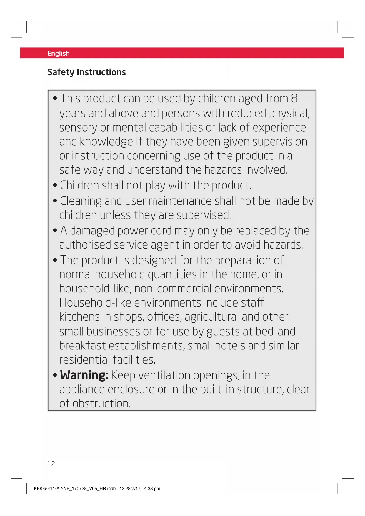 - Warning: Keep ventilation openings, in the appliance enclosure or in the built-in structure, clear of obstruction. KFK45411-A2-NF_170728_V05_HR.indb 12 28/7/17 4:33 pmEnglish