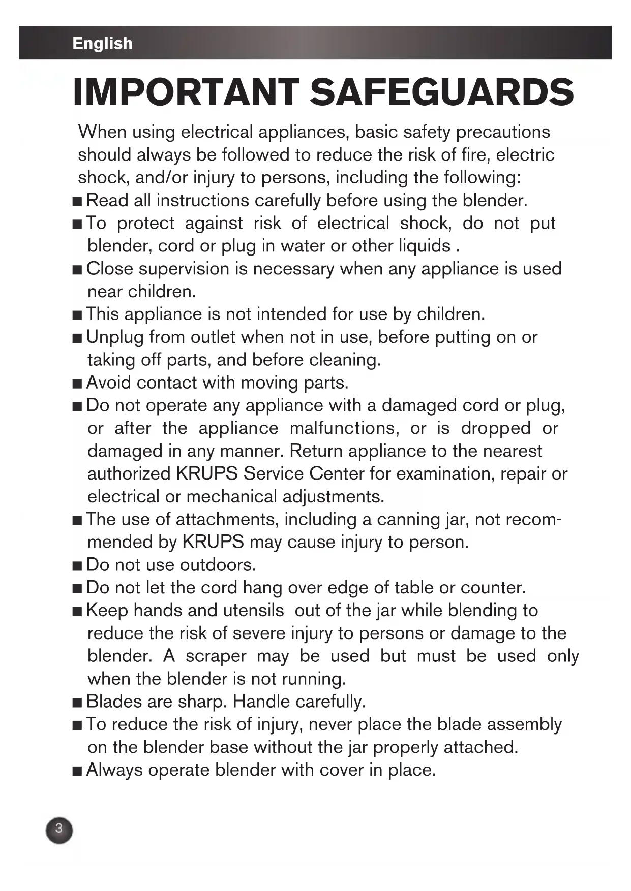 IMPORTANT SAFEGUARDS When using electrical appliances, basic safety precautions should always be followed to reduce the risk of fire, electric shock, and/or injury to persons, including the following: ■ Read all instructions carefully before using the blender. ■ To protect against risk of electrical shock, do not put blender, cord or plug in water or other liquids . ■ Close supervision is necessary when any appliance is used near children. ■ This appliance is not intended for use by children. ■ Unplug from outlet when not in use, before putting on or taking off parts, and before cleaning. ■ Avoid contact with moving parts. ■ Do not operate any appliance with a damaged cord or plug, or after the appliance malfunctions, or is dropped or damaged in any manner. Return appliance to the nearest authorized KRUPS Service Center for examination, repair or electrical or mechanical adjustments. ■ The use of attachments, including a canning jar, not recom- mended by KRUPS may cause injury to person. ■ Do not use outdoors. ■ Do not let the cord hang over edge of table or counter. ■ Keep hands and utensils out of the jar while blending to reduce the risk of severe injury to persons or damage to the blender. A scraper may be used but must be used only when the blender is not running. ■ Blades are sharp. Handle carefully. ■ To reduce the risk of injury, never place the blade assembly on the blender base without the jar properly attached. ■ Always operate blender with cover in place.English ■ When blending hot liquids, remove measuring cup (center piece of cover) to allow steam to escape. ■ Make certain the voltage of the appliance is in accordance with your domestic supply. ■ Never use the blender on a hot surface or near fire. ■ Do not place ingredients bigger than one inch into the blender. They could jam the blades and overheat the motor. ■ Do not use the appliance for other than intended use. ■ Do not place the blender jar in a microwave oven. SAVE THESE INSTRUCTIONS 4English