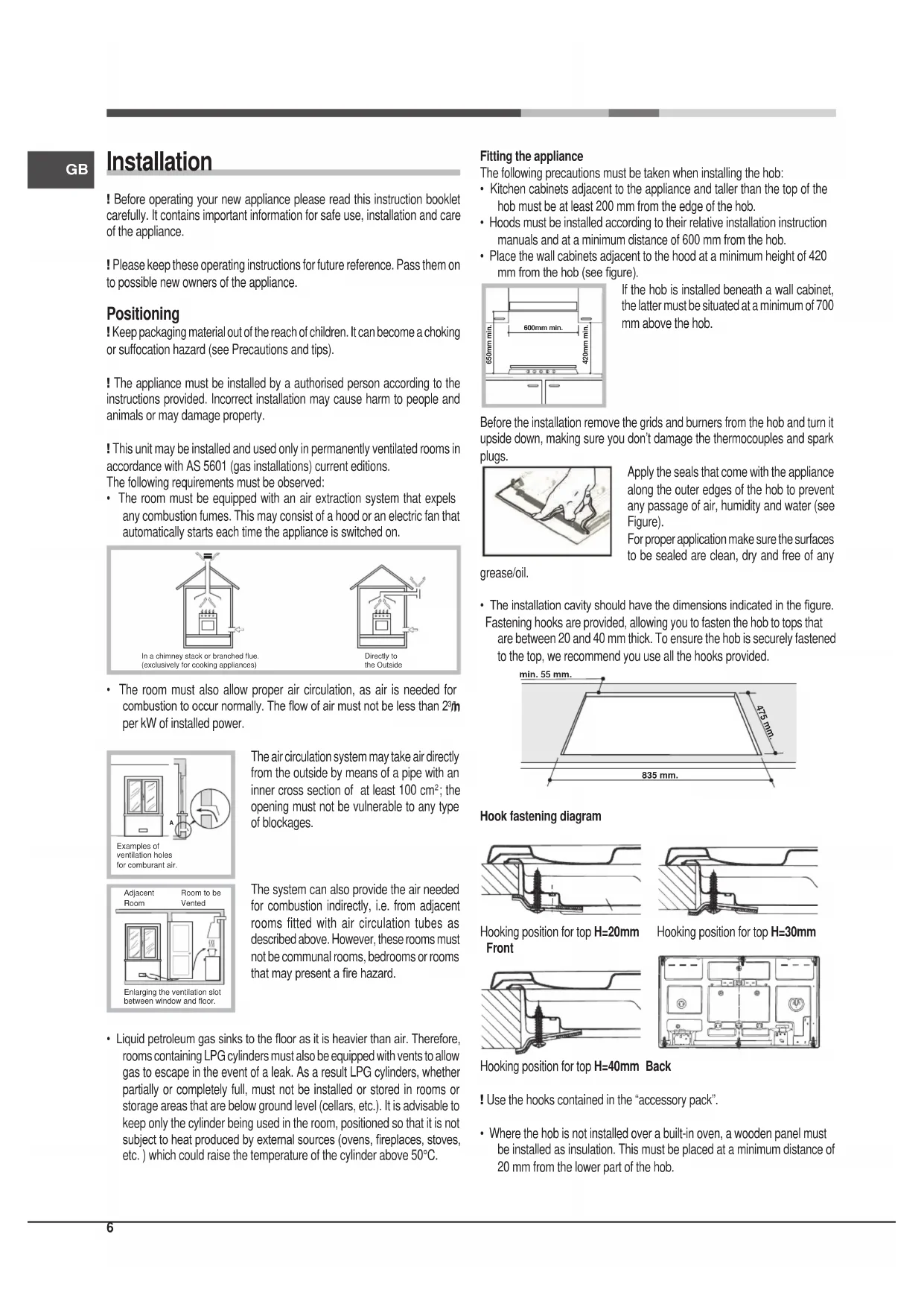 Installation ! Before operating your new appliance please read this instruction booklet carefully. It contains important information for safe use, installation and care of the appliance. ! Please keep these operating instructions for future reference. Pass them on to possible new owners of the appliance. Positioning ! Keep packaging material out of the reach of children. It can become a choking or suffocation hazard (see Precautions and tips). ! The appliance must be installed by a authorised person according to the instructions provided. Incorrect installation may cause harm to people and animals or may damage property. ! This unit may be installed and used only in permanently ventilated rooms in accordance with AS 5601 (gas installations) current editions. The following requirements must be observed: