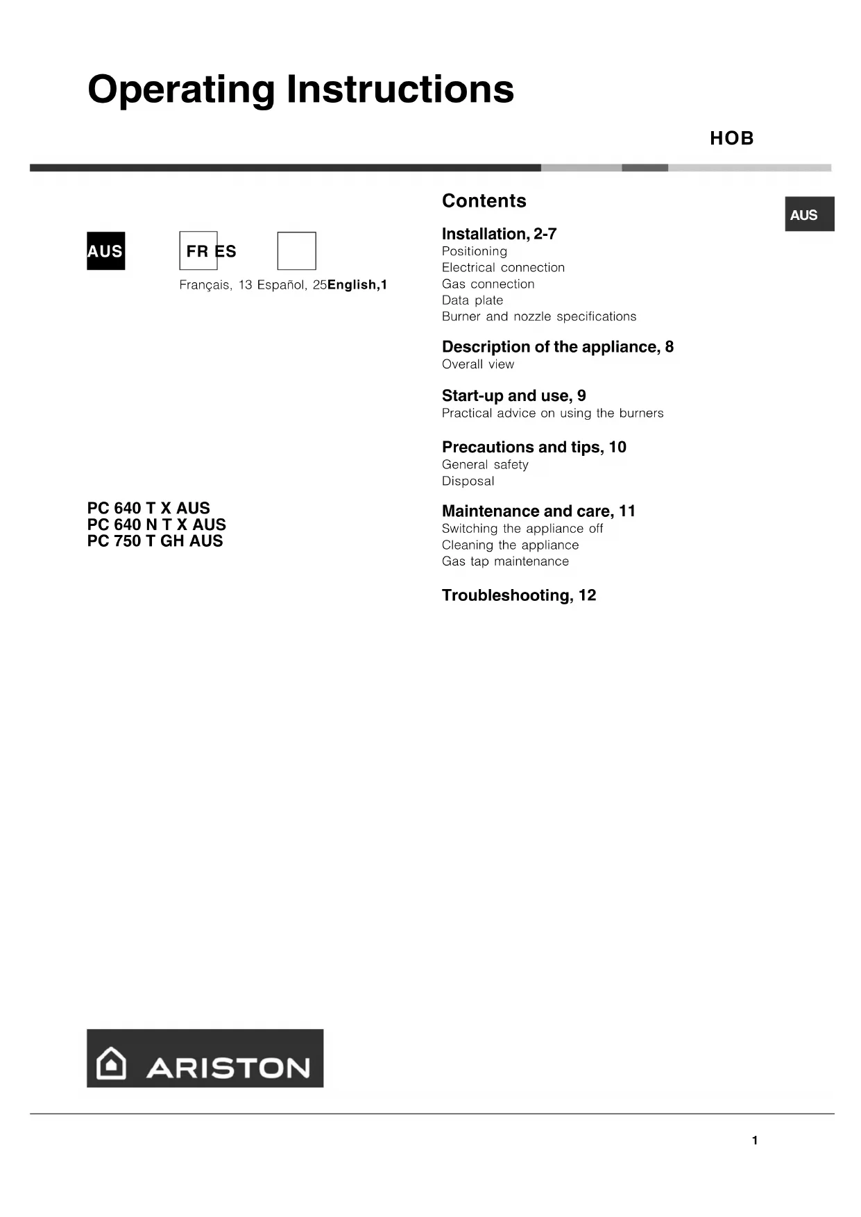 Contents Installation, 2-7 Positioning Electrical connection Gas connection Data plate Burner and nozzle specifications Description of the appliance, 8 Overall view Start-up and use, 9 Practical advice on using the burners Precautions and tips, 10 General safety Disposal Maintenance and care, 11 Switching the appliance off Cleaning the appliance Gas tap maintenance Troubleshooting, 12 Operating Instructions Français, 13 Español, 25English,1 FR ES AUSAUS