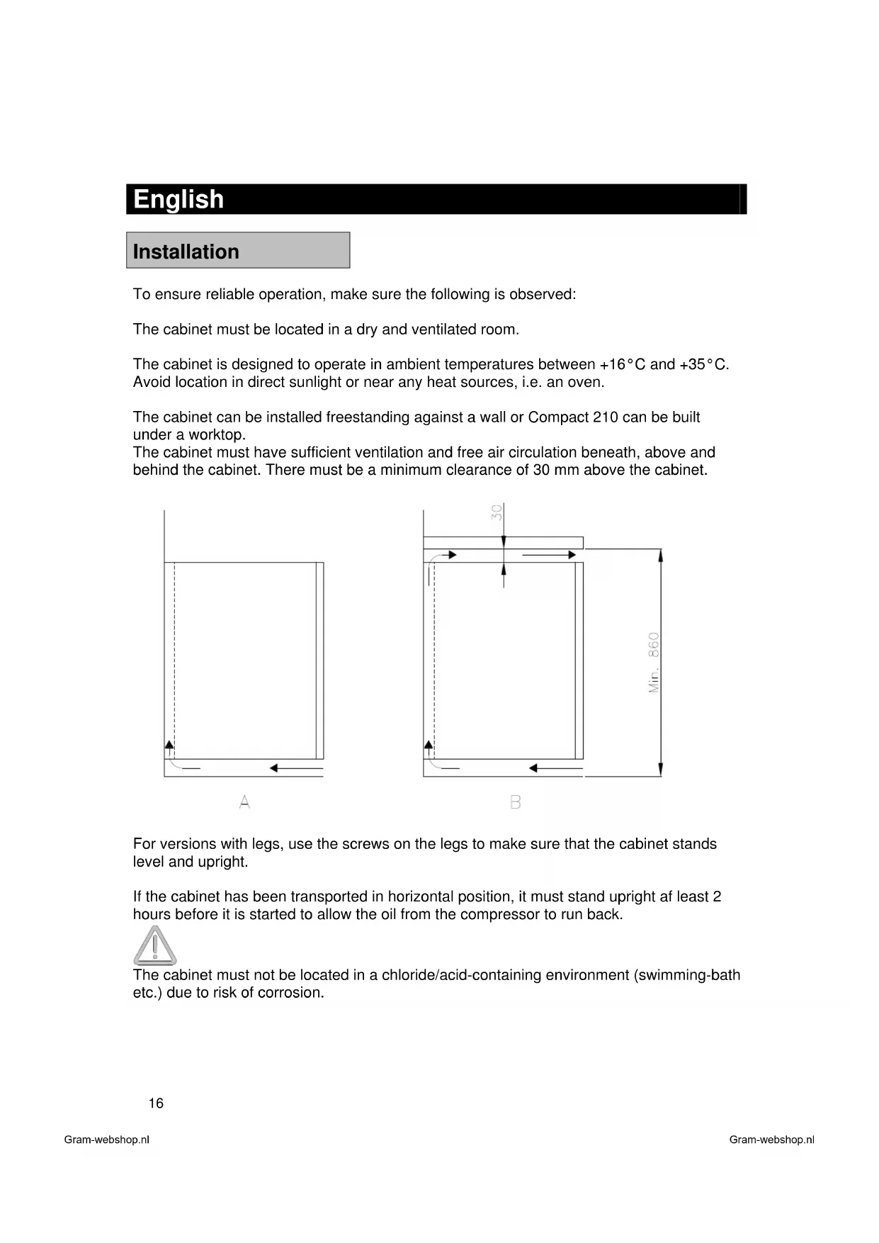 For versions with legs, use the screws on the legs to make sure that the cabinet stands level and upright. If the cabinet has been transported in horizontal position, it must stand upright af least 2 hours before it is started to allow the oil from the compressor to run back. The cabinet must not be located in a chloride/acid-containing environment (swimming-bath etc.) due to risk of corrosion. Gram-webshop.nl Gram-webshop.nl17 Important!