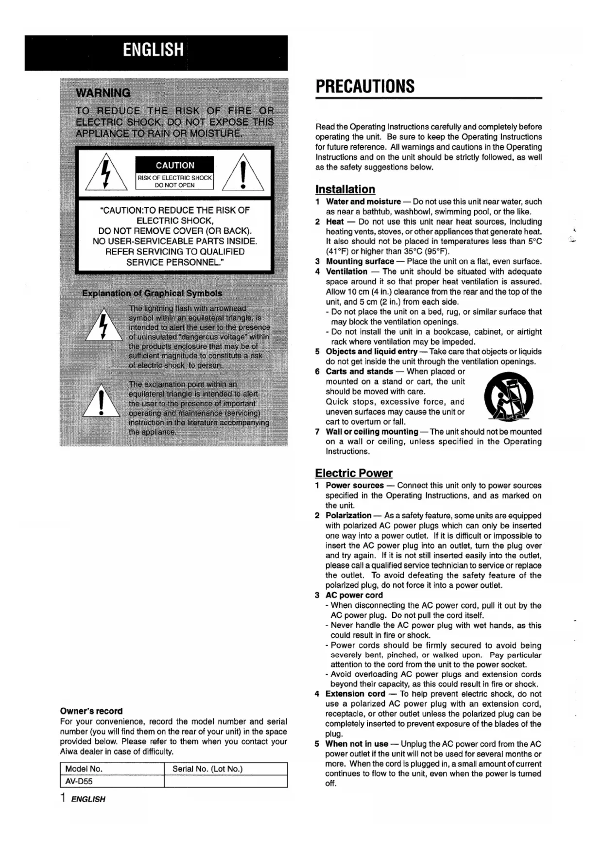 For assistance and information call toll free l-800-BUY-AIWA (United States and Puerto Rico) 8Z-AR3-903-01 99021 5AcK.yJ3Owner’s record For your convenience, record the model number and serial number (you will find them on the rear of your unit) in the space provided below. Please refer to them when you contact your Aiwa dealer in case of difficulty. Model No. Serial No. (Lot No.) AV-D55 1 ENGLISH PRECAUTIONS Read the Operating Instructions carefully and completely before operating the unit. Be sure to keep the Operating Instructions for future reference. All warnings and cautions in the Operating Instructions and on the unit should be strictly followed, as well as the safety suggestions below. Installation