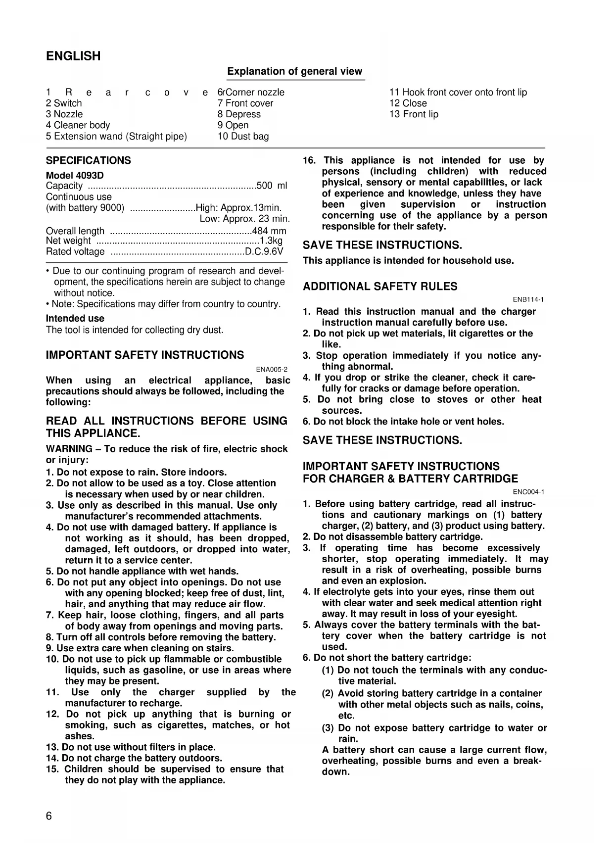 IMPORTANT SAFETY INSTRUCTIONS FOR CHARGER & BATTERY CARTRIDGE