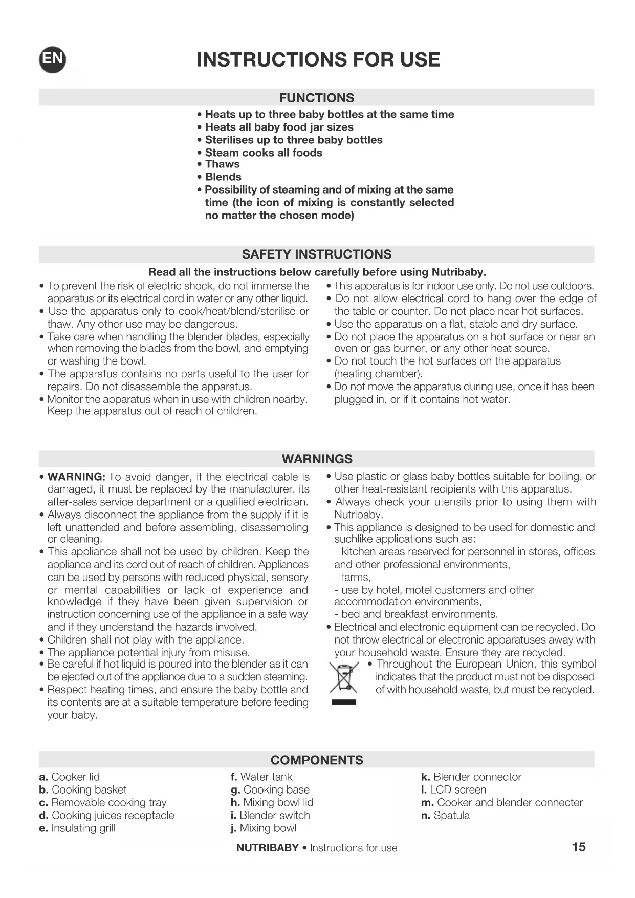 - Throughout the European Union, this symbol indicates that the product must not be disposed of with household waste, but must be recycled. SAFETY INSTRUCTIONS Read all the instructions below carefully before using Nutribaby.