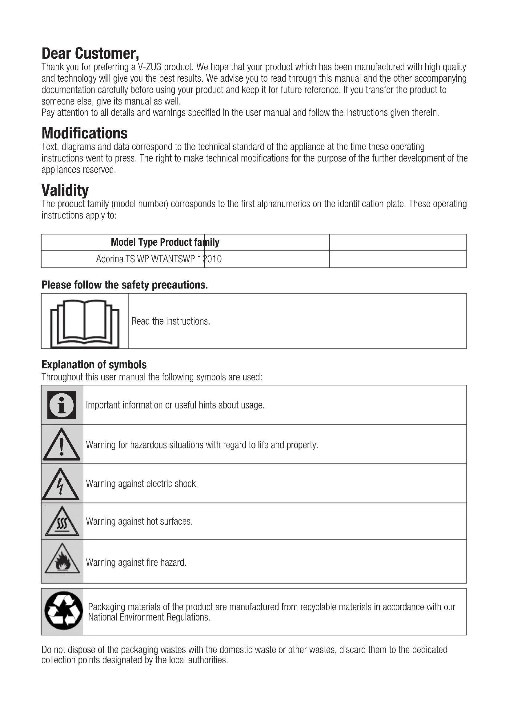 USER MANUAL WTANTSWPl V-ZUG