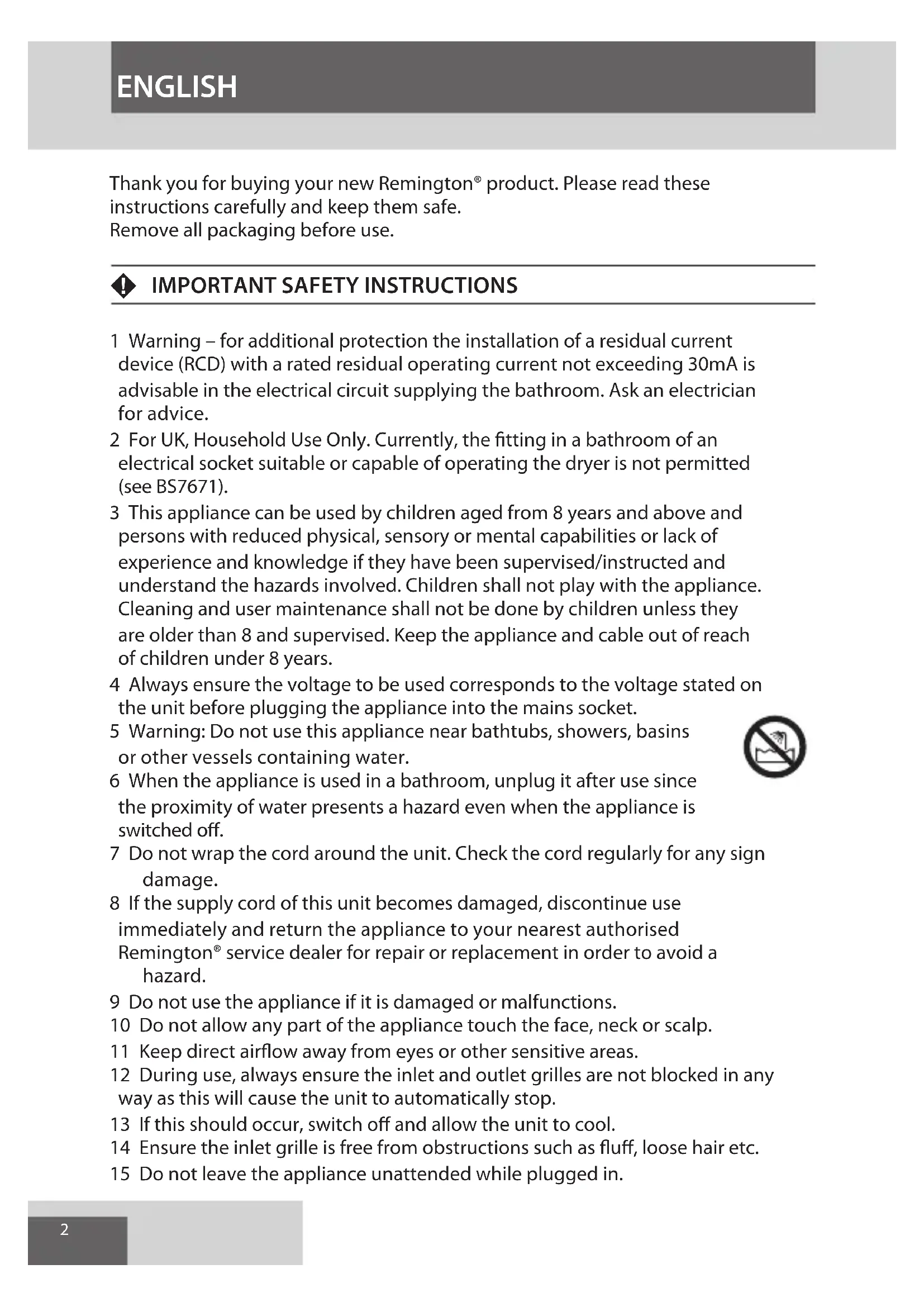 Thank you for buying your new Remington® product. Please read these instructions carefully and keep them safe.