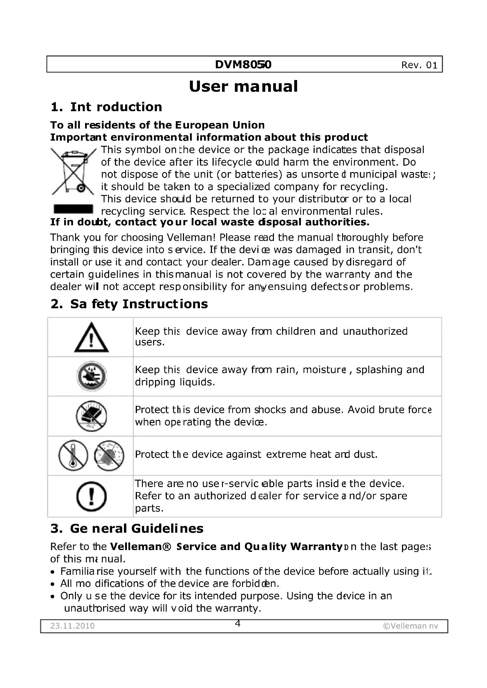 eVelleman® Service and Quality Warranty Velleman® has over 35 years of experience in the electronics world and distributes its products in more than 85 countries. All our products fulfil strict quality requirements and legal stipulations in the EU. In order to ensure the quality, our products regularly go through an extra quality check, both by an internal quality department and by specialized external organisations. If, all precautionary measures notwithstanding, problems should occur, please make appeal to our warranty (see guarantee conditions). General Warranty Conditions Concerning Consumer Products (for EU):