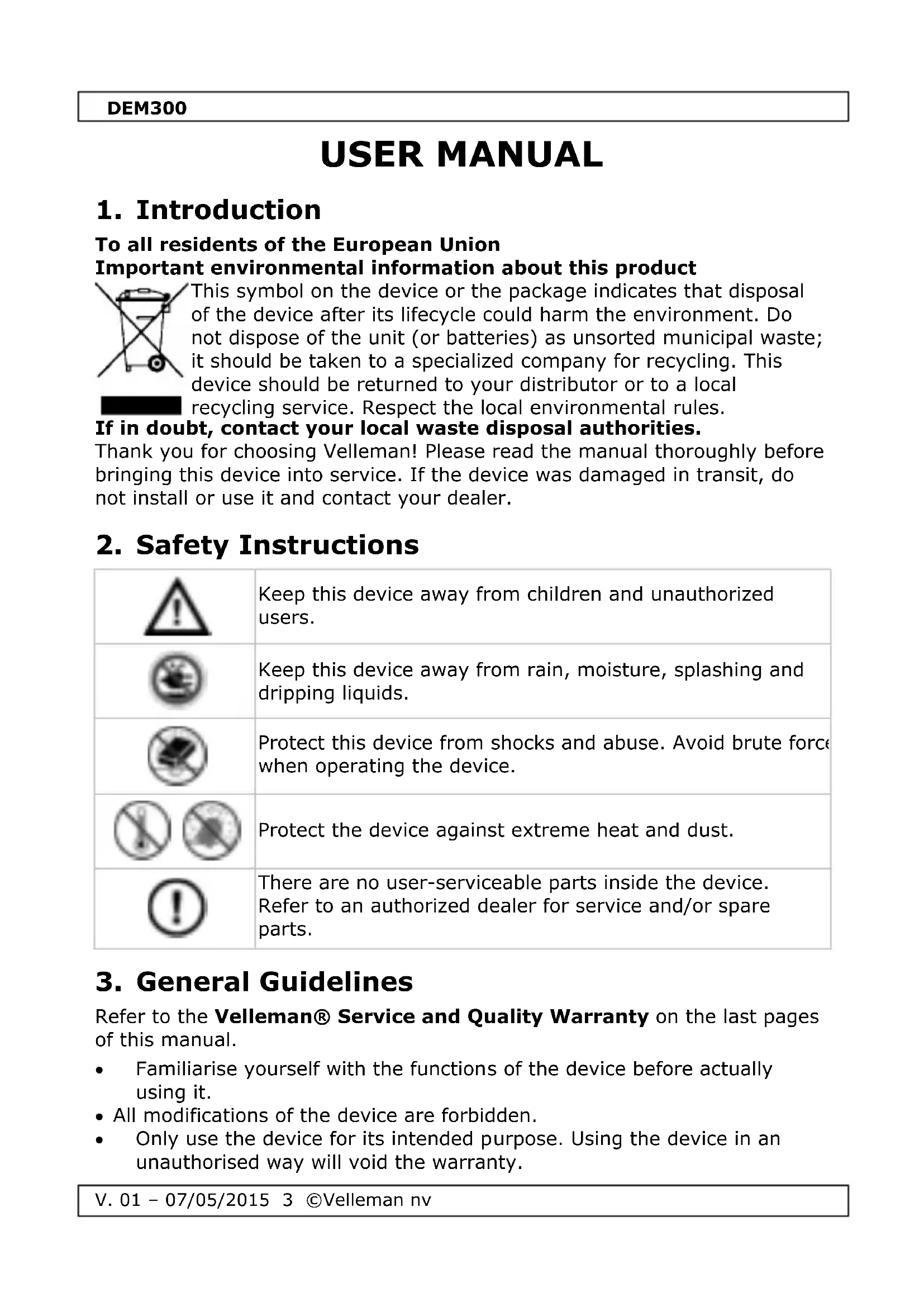 Refer to the Velleman® Service and Quality Warranty on the last pages of this manual. Familiarise yourself with the functions of the device before actually using it. All modifications of the device are forbidden. Only use the device for its intended purpose. Using the device in an unauthorised way will void the warranty.DEM300