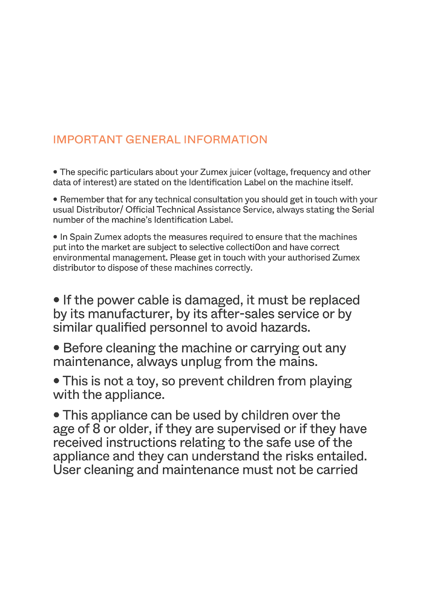 SCOPE OF THE WARRANTY: The unit has a two-year warranty against defects and construction problems that could harm the correct operation, provided that the inner parts or mechanisms have not been manipulated. The following are excluded from the warranty. EXCLUSIONS: Labor, trips, transport, parts that have become deteriorated due to natural wear as a consequence of use, as well as any damage resulting from the incorrect usage or installation of the unit and faults caused as a result of force majeure. Any incorrect handling of the ID Label will make the Warranty void. Likewise, the warranty will also be void if other persons handle the unit, since only the Ocial Technical Support Service is qualified and authorized to do so. Always provide the SERIAL Nr. on the ID Label when contacting the Technical Support Service.YOUR ZUMEX DISTRIBUTORwww.zumex.com