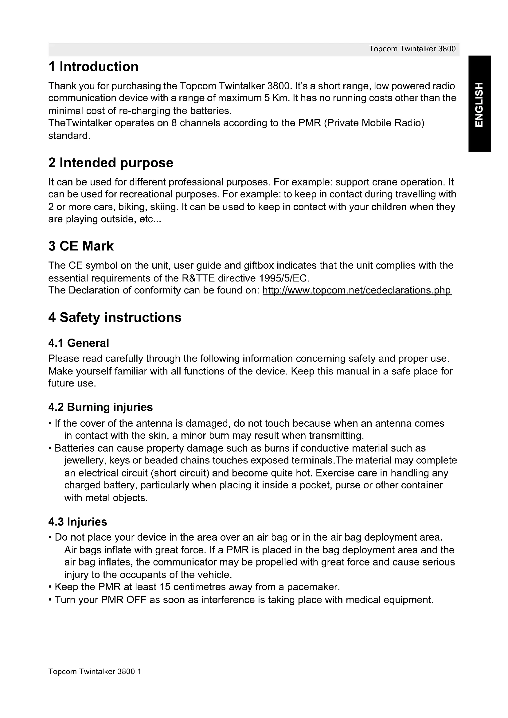 14Topcom Twintalker 3800 1 Topcom Twintalker 3800 ENGLISH 1 Introduction Thank you for purchasing the Topcom Twintalker 3800. It’s a short range, low powered radio communication device with a range of maximum 5 Km. It has no running costs other than the minimal cost of re-charging the batteries. TheTwintalker operates on 8 channels according to the PMR (Private Mobile Radio) standard. 2 Intended purpose It can be used for different professional purposes. For example: support crane operation. It can be used for recreational purposes. For example: to keep in contact during travelling with 2 or more cars, biking, skiing. It can be used to keep in contact with your children when they are playing outside, etc... 3 CE Mark The CE symbol on the unit, user guide and giftbox indicates that the unit complies with the essential requirements of the R&TTE directive 1995/5/EC. The Declaration of conformity can be found on: http://www.topcom.net/cedeclarations.php 4 Safety instructions