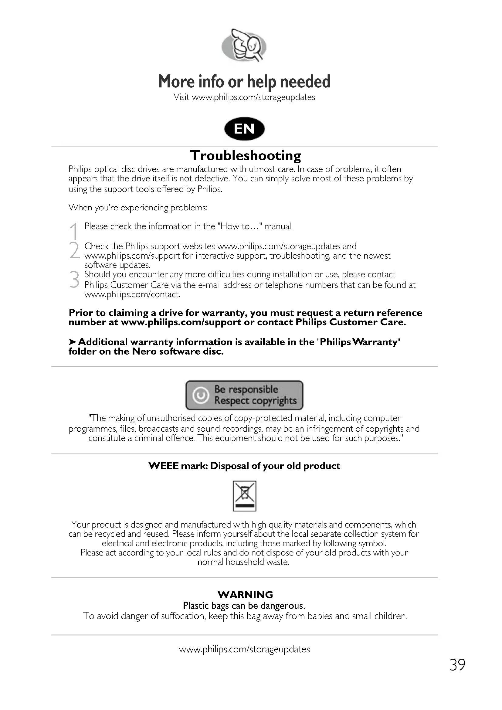 2 Check the Philips support websites www.philips.com/storageupdates and www.philips.com/support for interactive support, troubleshooting, and the newest software updates.