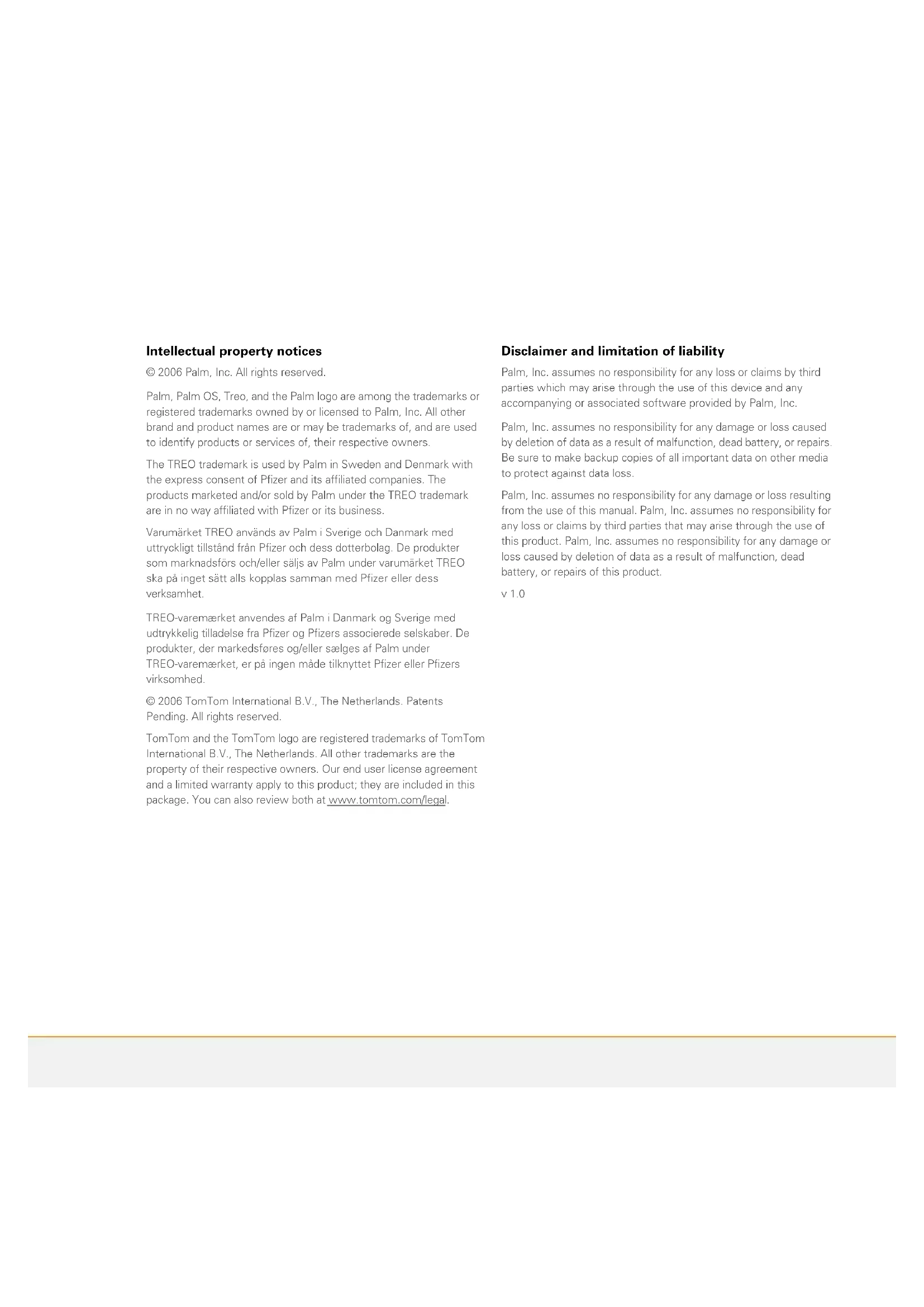 Disclaimer and limitation of liability Palm, Inc. assumes no responsibility for any loss or claims by third parties which may arise through the use of this device and any accompanying or associated software provided by Palm, Inc. Palm, Inc. assumes no responsibility for any damage or loss caused by deletion of data as a result of malfunction, dead battery, or repairs. Be sure to make backup copies of all important data on other media to protect against data loss. Palm, Inc. assumes no responsibility for any damage or loss resulting from the use of this manual. Palm, Inc. assumes no responsibility for any loss or claims by third parties that may arise through the use of this product. Palm, Inc. assumes no responsibility for any damage or loss caused by deletion of data as a result of malfunction, dead battery, or repairs of this product. v 1.0GETTING STARTED