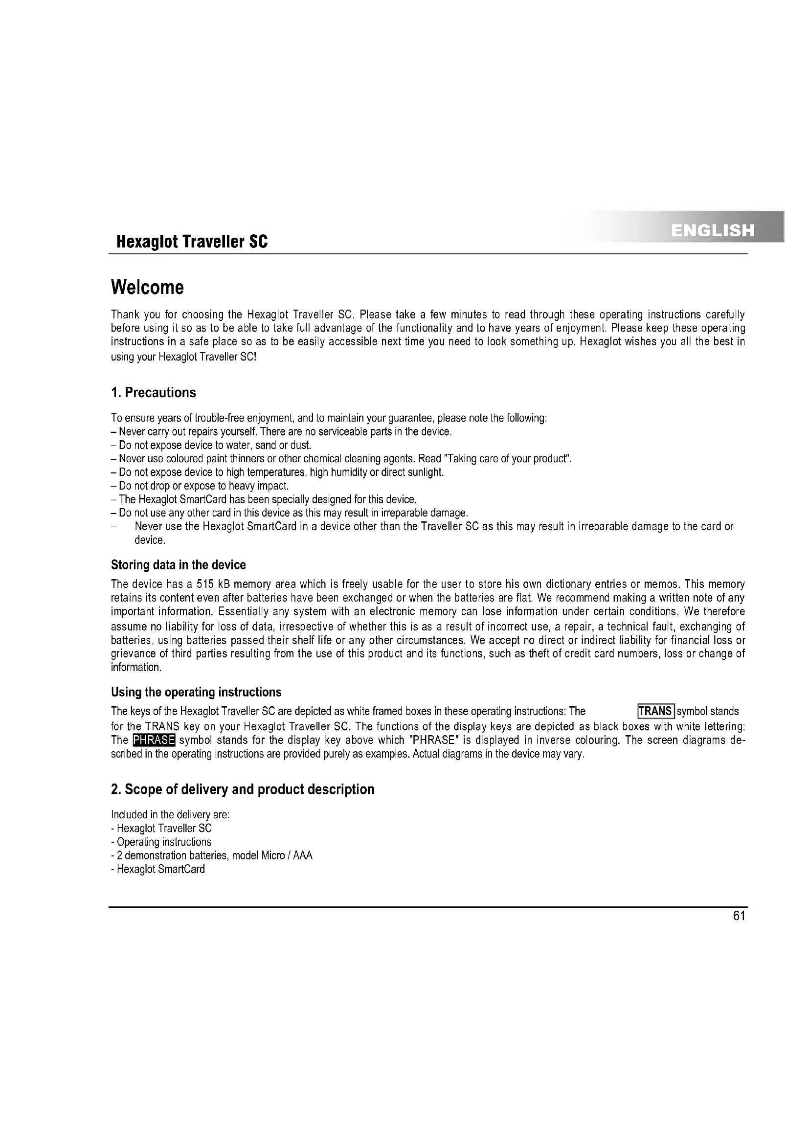 ENGLISH Welcome Thank you for choosing the Hexaglot Traveller SC. Please take a few minutes to read through these operating instructions carefully before using it so as to be able to take full advantage of the functionality and to have years of enjoyment. Please keep these operating instructions in a safe place so as to be easily accessible next time you need to look something up. Hexaglot wishes you all the best in using your Hexaglot Traveller SC!