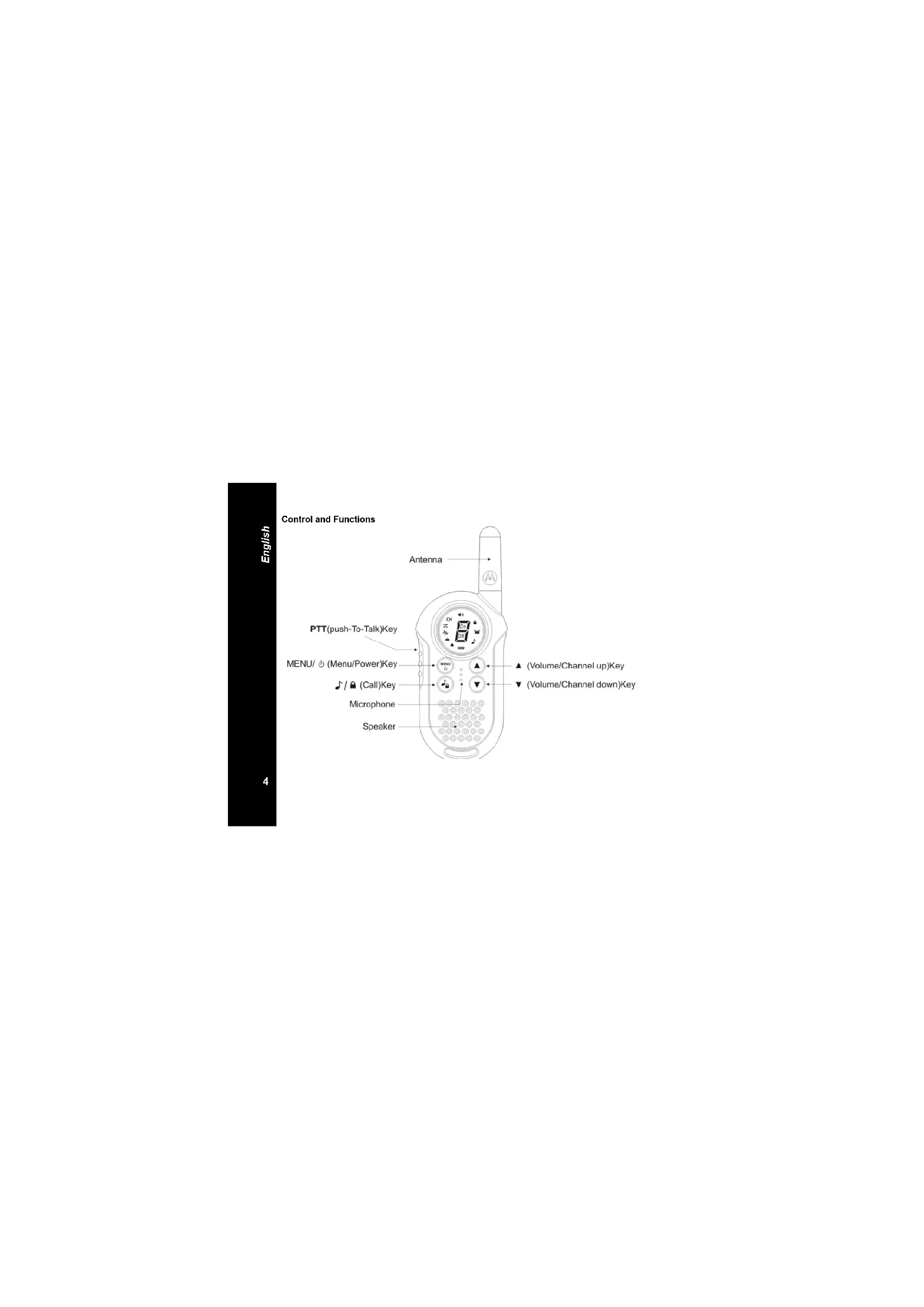 Control and Functions5 English Congratulations on your purchase of the PMR ( P r i v a t e M o b i l e R a d i o ) L o w T i e r r a d i o . This product is a lightweight, palm-sized radio. Use it at sporting events to stay in contact with family and friends, hiking, skiing, outdoors, or in a neighborhood watch for vital communication. This compact, state-of-the-art device is equipped with many features. Package Contents Your package contains two TLKR T4 radios, two belt clips and this reference guide. You may operate the unit with 3 AAA alkaline batteries per handset (not included). Install the Battery Your TLKR T4 radio uses 3 AAA alkaline batteries (not included). If alkaline batteries are used, we recommend using high quality alkaline batteries. To install the alkaline batteries: