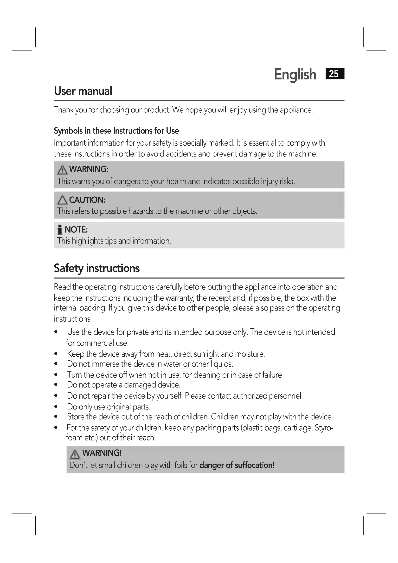 This warns you of dangers to your health and indicates possible injury risks. CAUTION: This refers to possible hazards to the machine or other objects. NOTE: This highlights tips and information. Safety instructions Read the operating instructions carefully before putting the appliance into operation and keep the instructions including the warranty, the receipt and, if possible, the box with the internal packing. If you give this device to other people, please also pass on the operating instructions.