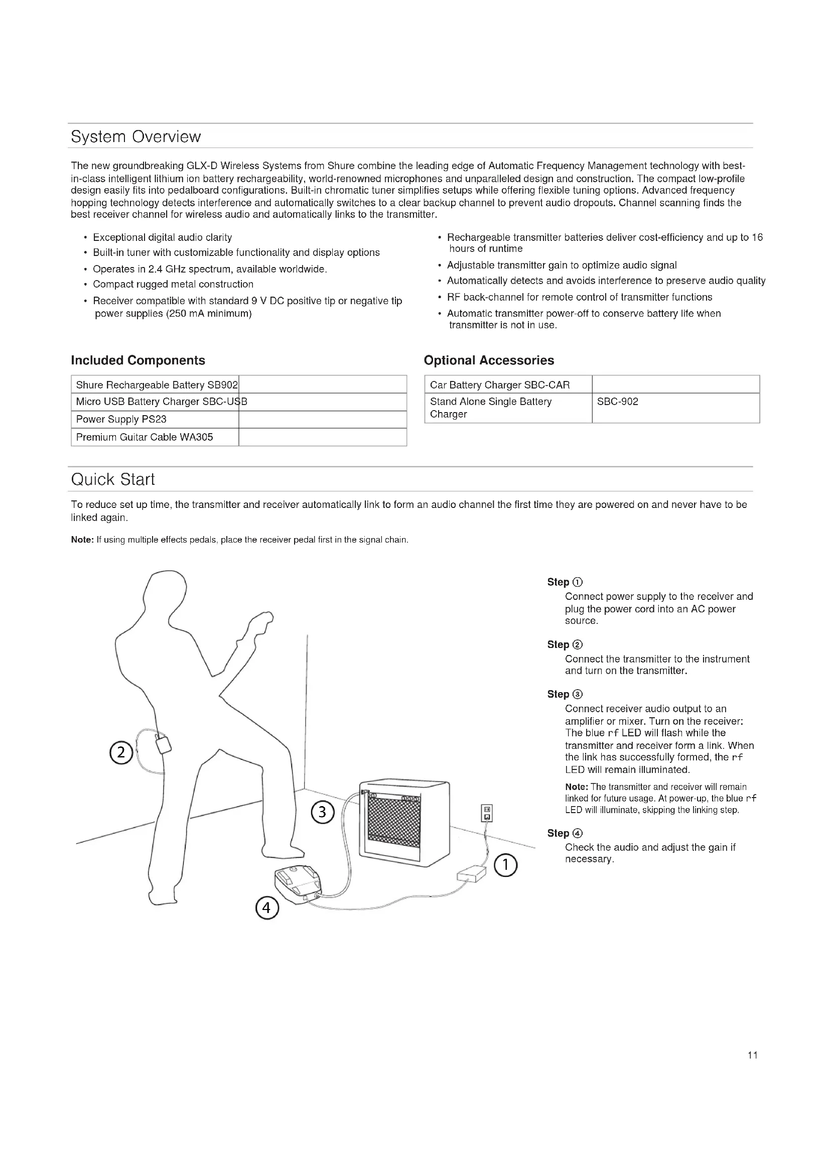 System Overview The new groundbreaking GLX-D Wireless Systems from Shure combine the leading edge of Automatic Frequency Management technology with best- in-class intelligent lithium ion battery rechargeability, world-renowned microphones and unparalleled design and construction. The compact low-profile design easily fits into pedalboard configurations. Built-in chromatic tuner simplifies setups while offering flexible tuning options. Advanced frequency hopping technology detects interference and automatically switches to a clear backup channel to prevent audio dropouts. Channel scanning finds the best receiver channel for wireless audio and automatically links to the transmitter.