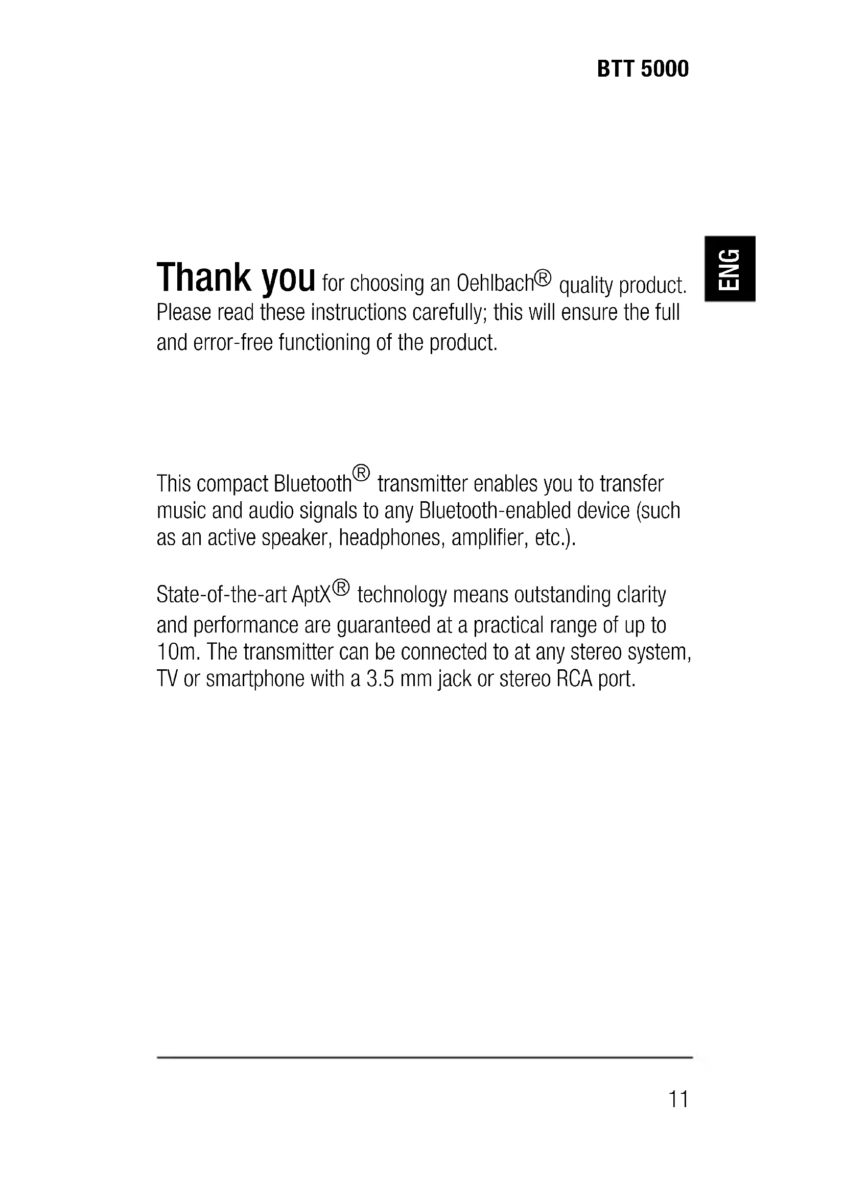 technology means outstanding clarity and performance are guaranteed at a practical range of up to 10m. The transmitter can be connected to at any stereo system, TV or smartphone with a 3.5 mm jack or stereo RCA port.12 Functions ∙ Audio streaming to any Bluetooth-enabled device ∙ High quality Bluetooth audio with aptX® support ∙ Dual-pairing - connect up to two devices simultaneously ∙ 44.1kHz and 16bit (CD quality) audio formats supported Specification Range: up to 10m A2DP Data rate (Audio): up to 345kbps Frequency response: 20Hz to 20kHz Temperature range: 0 to +50 °C Permissible rel. humidity: 5 to 90% Dimensions (w x h x d): 31 x 15 x 75 mm Weight: 0,03 kg Packaging contents ∙ Oehlbach Bluetooth Audio Transmitter - BTT 5000 ∙ 3.5mm stereo jack cable ∙ 3.5 mm to stereo RCA adapter ∙ USB mains adapter ∙ Operating instructions13 ENG BTT 5000 Operation Connection instructions: