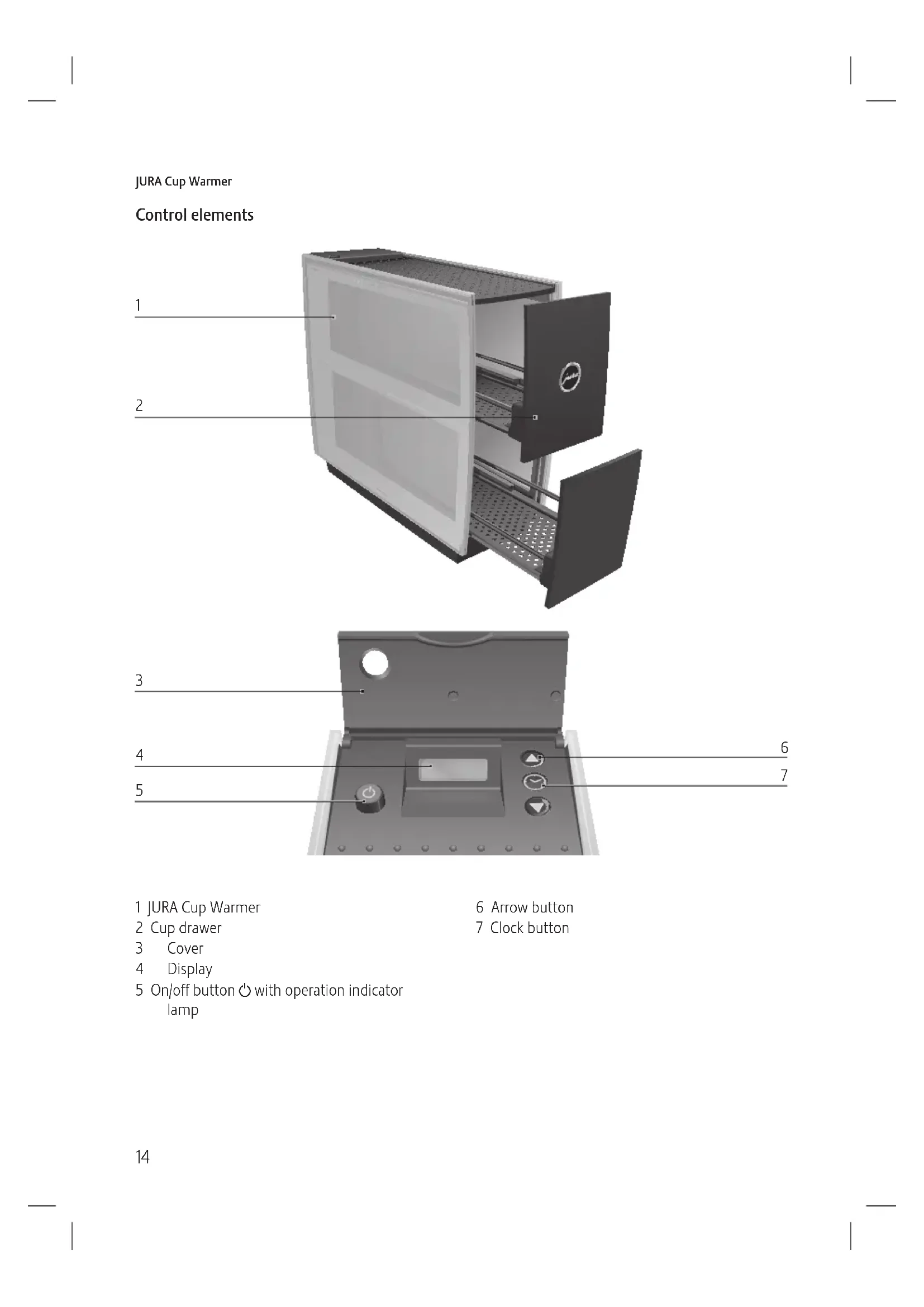en14 JURA Cup Warmer 1 JURA Cup Warmer 2 Cup drawer 3 Cover 4 Display 5 On/off button Q with operation indicator lamp 6 Arrow button 7 Clock button