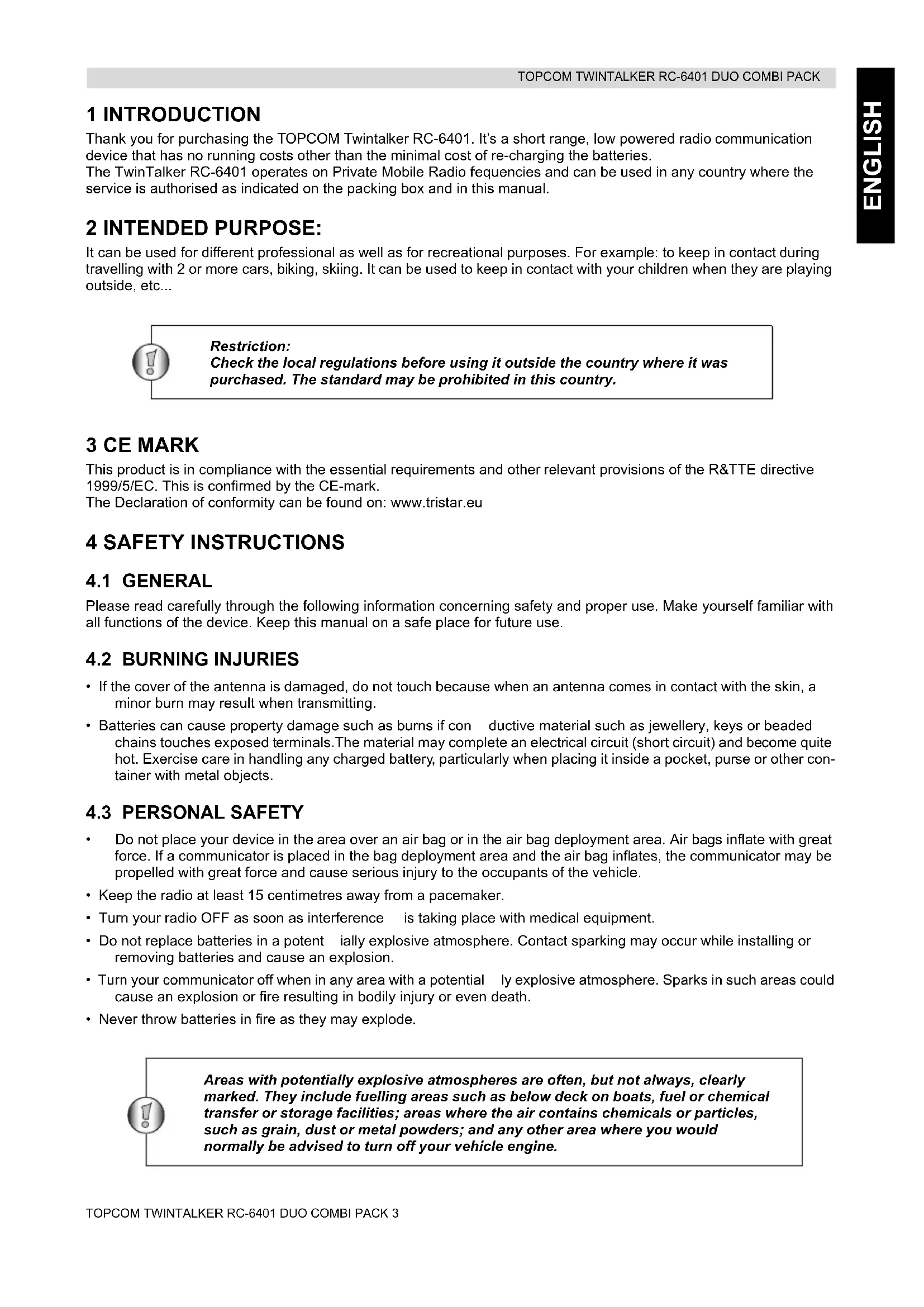ENGLISH 1 INTRODUCTION Thank you for purchasing the TOPCOM Twintalker RC-6401. It’s a short range, low powered radio communication device that has no running costs other than the minimal cost of re-charging the batteries. The TwinTalker RC-6401 operates on Private Mobile Radio f requencies and can be used in any country where the service is authorised as indicated on the packing box and in this manual. 2 INTENDED PURPOSE: It can be used for different professional as well as for recreational purposes. For example: to keep in contact during travelling with 2 or more cars, biking, skiing. It can be used to keep in contact with your children when they are playing outside, etc... Restriction: Check the local regulations before using it outside the country where it was purchased. The standard may be prohibited in this country. 3 CE MARK This product is in compliance with the essential requirements and other relevant provisions of the R&TTE directive 1999/5/EC. This is confirmed by the CE-mark. The Declaration of conformity can be found on: www.tristar.eu 4 SAFETY INSTRUCTIONS