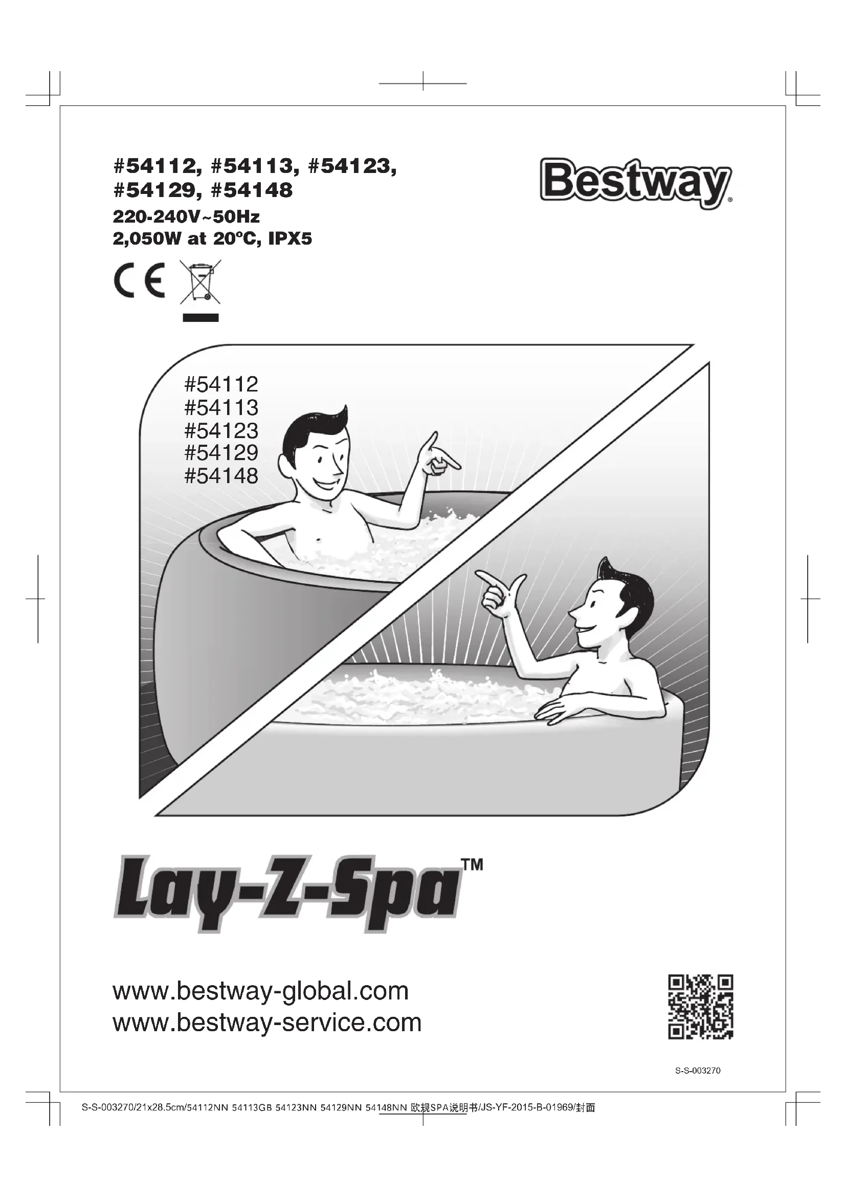 S-S-003270 Lay-Z-Spa Storage Disposal Make sure the spa and pump are completely dry. This is essential to extend the life of the spa. We recommend using the pump to blow dry the spa, pump and pipes. Remove the filter sets and discard the used filter cartridges. Re-attach the two stopper caps onto the spa’s inlet and outlet valves. It is recommended you store the spa in its original package in a warm dry place. TROUBLESHOOTING Bestway strives to provide the most trouble-free spas on the market. If you experience any problems whatsoever, do not hesitate to contact Bestway or your authorized dealer. Here are some helpful tips to help you to diagnose and rectify some common sources of trouble.Meaning of crossed-out wheeled dustbin symbol: Do not dispose of electrical appliances as unsorted municipal waste, use separate collection facilities. Contact your local government for information regarding the collection systems available. If electrical appliances are disposed of in landfills or dumps, hazardous substances can leak into the groundwater and get into the food chain, damaging your health and well-being. When replacing old appliances with new ones, the retailer is legally obligated to take back your old appliance for disposals at least free of charge. NOTE: Plastic becomes brittle and susceptible to breaking when exposed to subzero temperatures. Freezing can severely damage the spa. Improper winterization of your spa can void your warranty. Problems Pump does not operate Pump does not heat properly Lay-Z-Massage System does not work Pump adapters are not level with the spa adapters Spa leakage Water is not clean Probable Causes - Spa is torn or punctured Solutions - Check power source - Unplug and plug the pump back in - Contact your local Bestway After Sales service point to get instructions - Set to a higher temperature refer to section pump operation - Clean/replace the Filter Cartridge refer to section filter cartridge cleaning and replacement - Add water to specified levels - Press the Reset button on the pump refer to section pump operation - Contact your local Bestway After Sales service point to get instructions - Unplug the pump and wait two hours so the pump has cooled. Insert the plug and press the Lay-Z-Massage System Button - Press the Lay-Z-Massage System Button to reactivate - Contact your local Bestway After Sales service point to get instructions - Elevate the pump with wood or another type of insulated material to bring the pump's adapters level with the spa's adapters - Use provided repair patch - Increase filtration time - Clean/replace the Filter Cartridge refer to section filter cartridge cleaning and replacement - Refer to the chemical manufacturer’s instructions - Power failure - Test Button is pushed - Power circuits broken - Temperature set too low - Dirty Filter Cartridge - Improper water levels - The thermal cut-out cuts off - Heating element failed - Air Pump is too hot - The Lay-Z-Spa Massage stops automatically - Air pump is broken - One characteristic of PVC is that it changes shape, which is normal - Insufficient filtering time - Dirty Filter Cartridge - Improper water maintenanceS-S-003270/21x28.5cm/54112NN 54113GB 54123NN 54129NN 54148NN 欧规SPA说明书/JS-YF-2015-B-01969/英