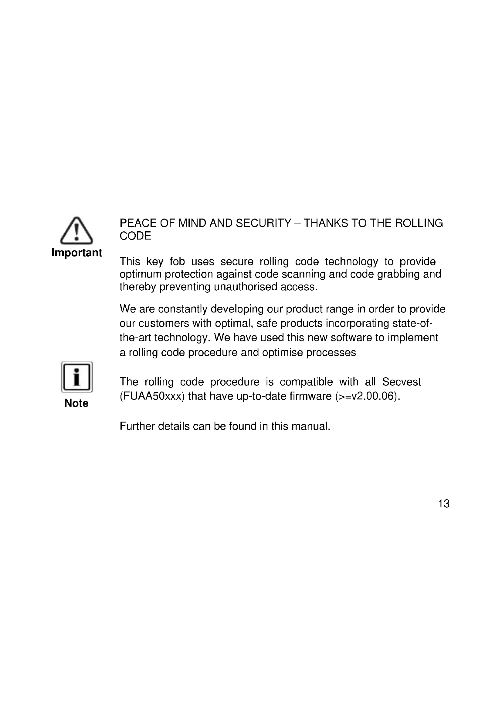 The rolling code procedure is compatible with all Secvest (FUAA50xxx) that have up-to-date firmware ( >=v2.00.06 ).