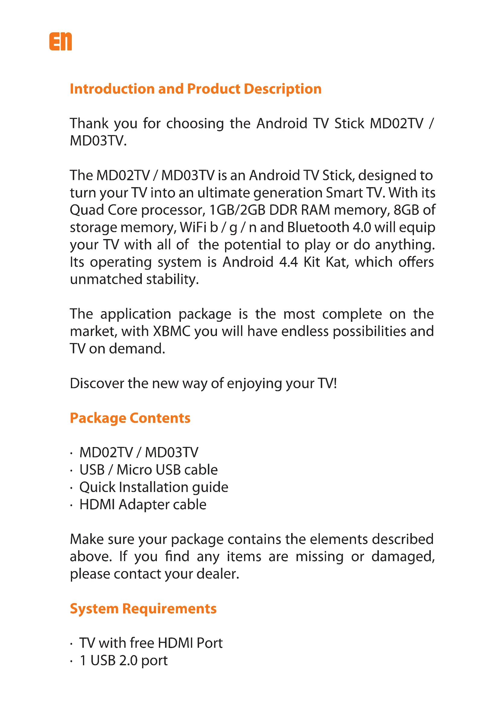 MD02TVEN Introduction and Product Description Thank you for choosing the Android TV Stick MD02TV / MD03TV. The MD02TV / MD03TV is an Android TV Stick, designed to turn your TV into an ultimate generation Smart TV. With its Quad Core processor, 1GB/2GB DDR RAM memory, 8GB of storage memory, WiFi b / g / n and Bluetooth 4.0 will equip your TV with all of the potential to play or do anything. Its operating system is Android 4.4 Kit Kat, which oers unmatched stability. The application package is the most complete on the market, with XBMC you will have endless possibilities and TV on demand. Discover the new way of enjoying your TV! Package Contents