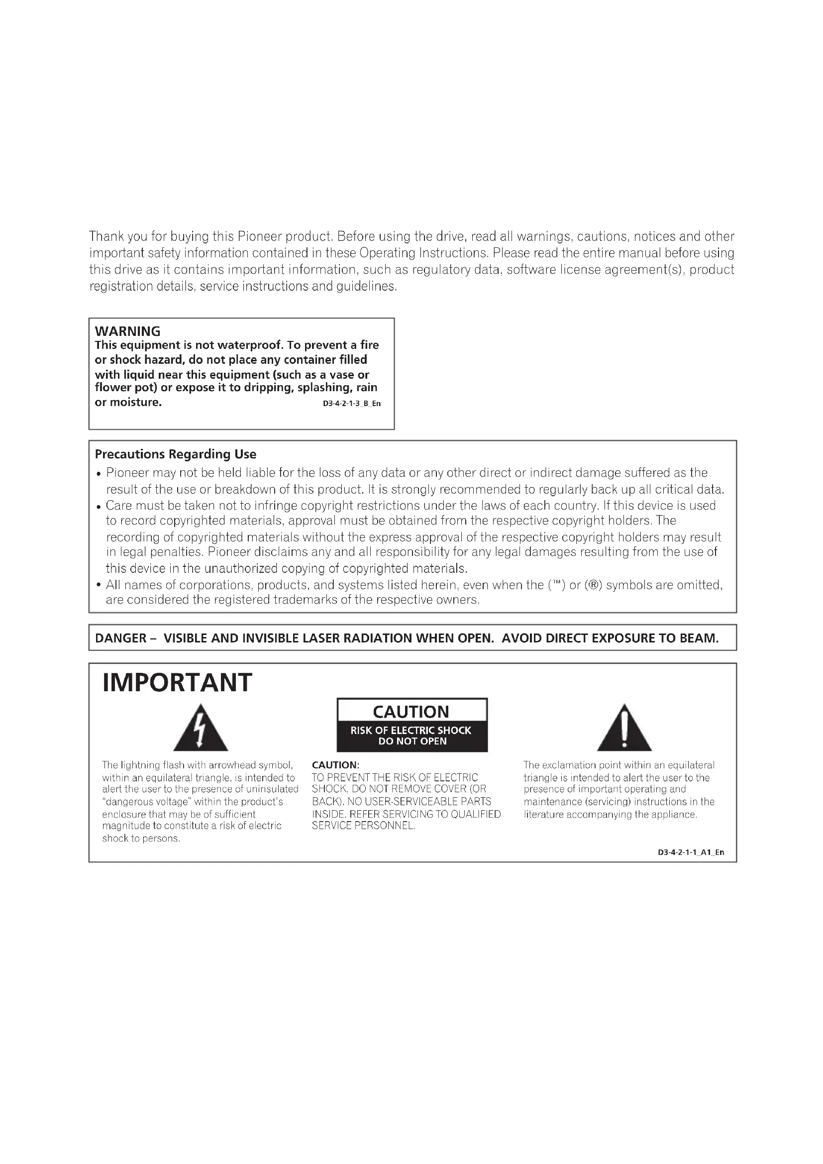 DANGER – VISIBLE AND INVISIBLE LASER RADIATION WHEN OPEN. AVOID DIRECT EXPOSURE TO BEAM. Pioneer may not be held liable for the loss of any data or any other direct or indirect damage suffered as the result of the use or breakdown of this product. It is strongly recommended to regularly back up all critical data. Care must be taken not to infringe copyright restrictions under the laws of each country. If this device is used to record copyrighted materials, approval must be obtained from the respective copyright holders. The recording of copyrighted materials without the express approval of the respective copyright holders may result in legal penalties. Pioneer disclaims any and all responsibility for any legal damages resulting from the use of this device in the unauthorized copying of copyrighted materials. All names of corporations, products, and systems listed herein, even when the (™) or (®) symbols are omitted, are considered the registered trademarks of the respective owners. The exclamation point within an equilateral triangle is intended to alert the user to the presence of important operating and maintenance (servicing) instructions in the literature accompanying the appliance.The lightning flash with arrowhead symbol, within an equilateral triangle, is intended to alert the user to the presence of uninsulated “dangerous voltage” within the product’s enclosure that may be of sufficient magnitude to constitute a risk of electric shock to persons.CAUTION:TO PREVENT THE RISK OF ELECTRIC SHOCK, DO NOT REMOVE COVER (OR BACK). NO USER-SERVICEABLE PARTS INSIDE. REFER SERVICING TO QUALIFIED SERVICE PERSONNEL. CAUTION