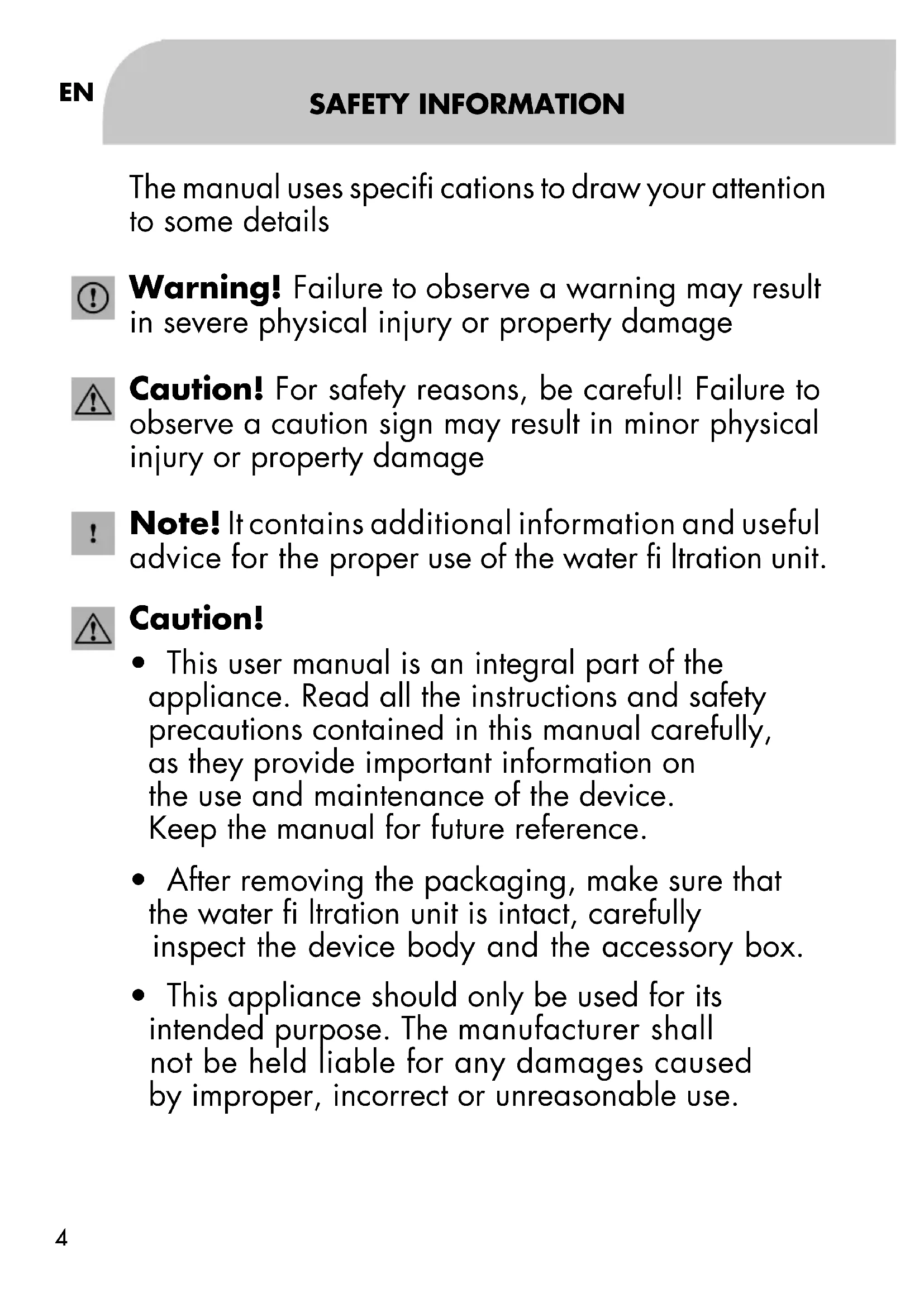 SAFETY INFORMATION The manual uses specifi cations to draw your attention to some details Warning! Failure to observe a warning may result in severe physical injury or property damage Caution! For safety reasons, be careful! Failure to observe a caution sign may result in minor physical injury or property damage Note! It contains additional information and useful advice for the proper use of the water fi ltration unit. Caution!