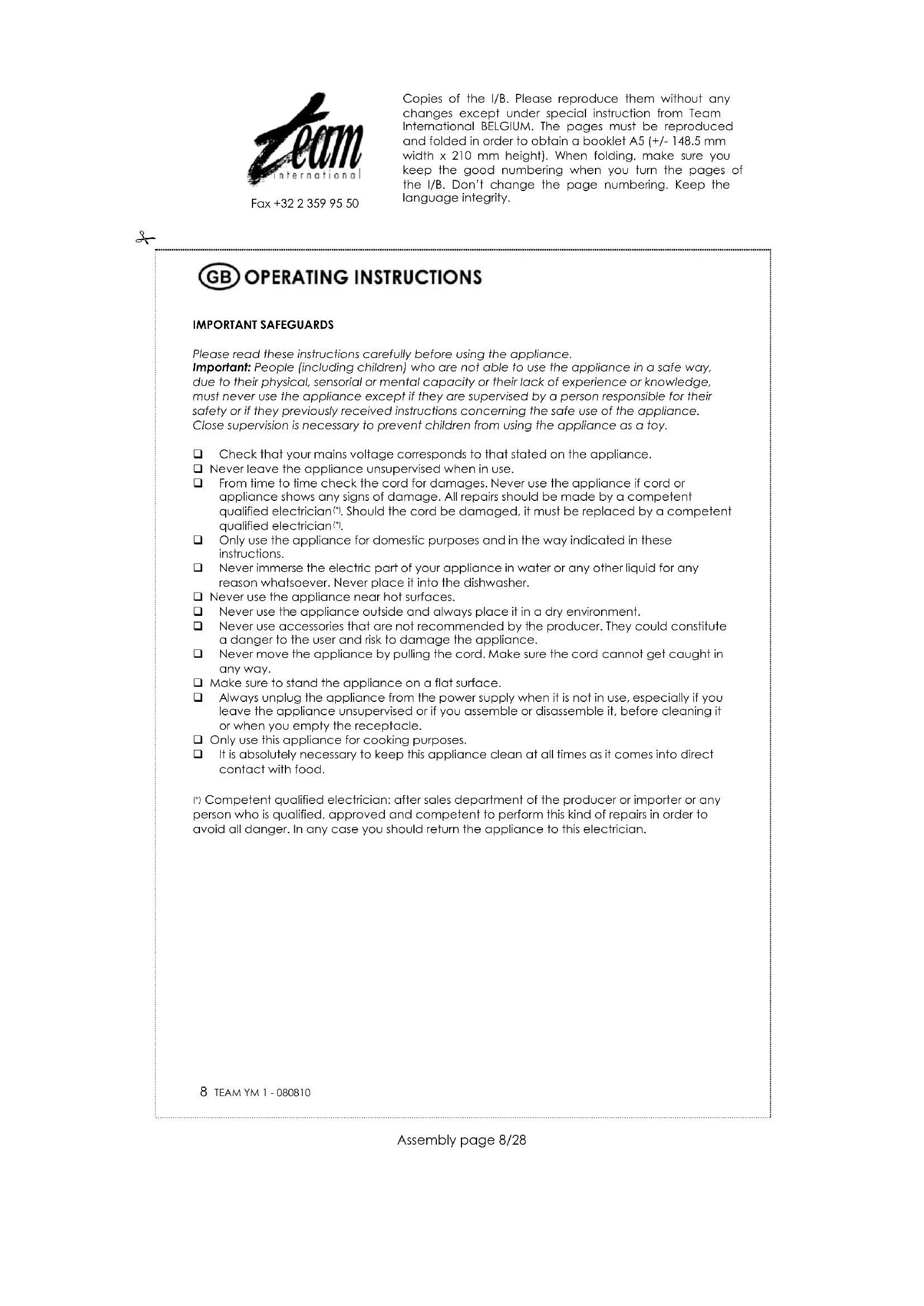 Fax +32 2 359 95 50 Copies of the I/B. Please reproduce them without any changes except under special instruction from Team International BELGIUM. The pages must be reproduced and folded in order to obtain a booklet A5 (+/- 148.5 mm width x 210 mm height). When folding, make sure you keep the good numbering when you turn the pages of the I/B. Don’t change the page numbering. Keep the language integrity.