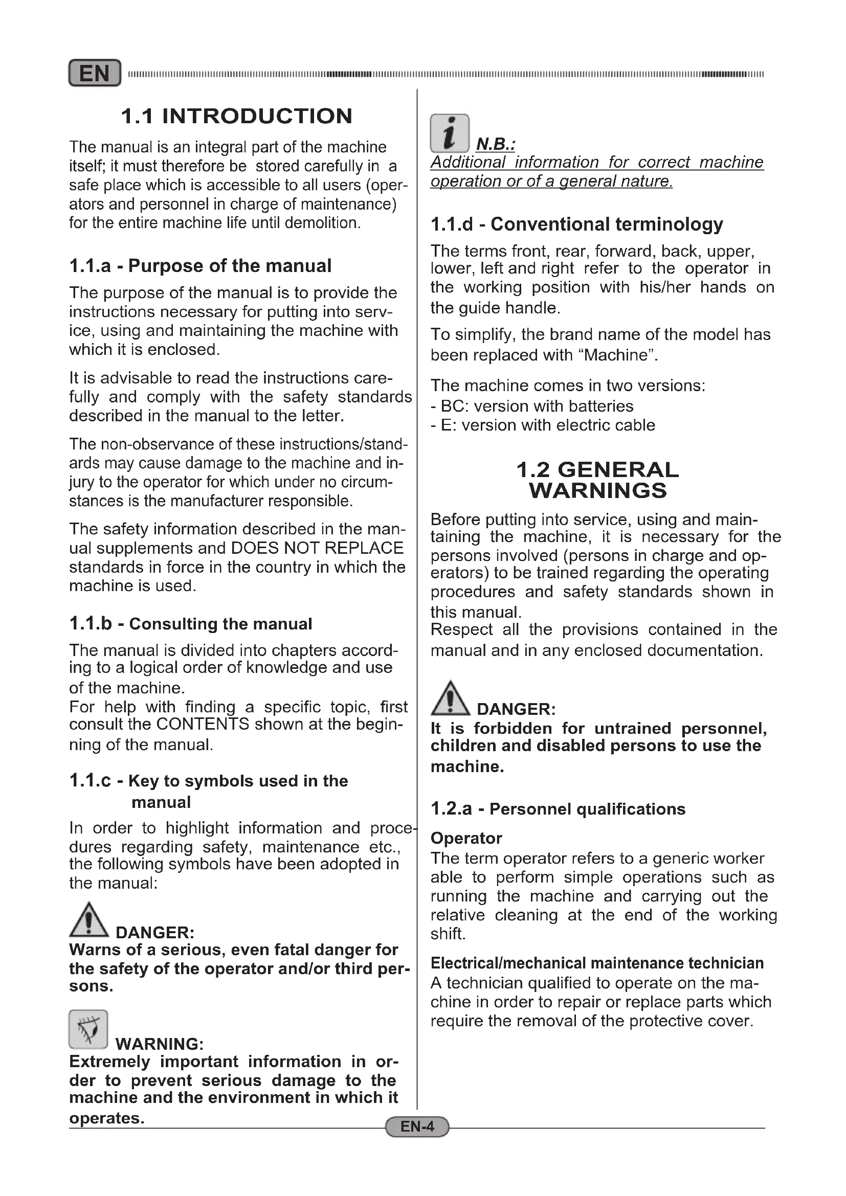 The terms front, rear, forward, back, upper, lower, left and right refer to the operator in the working position with his/her hands on the guide handle. To simplify, the brand name of the model has been replaced with “Machine”. The machine comes in two versions: - BC: version with batteries - E: version with electric cable