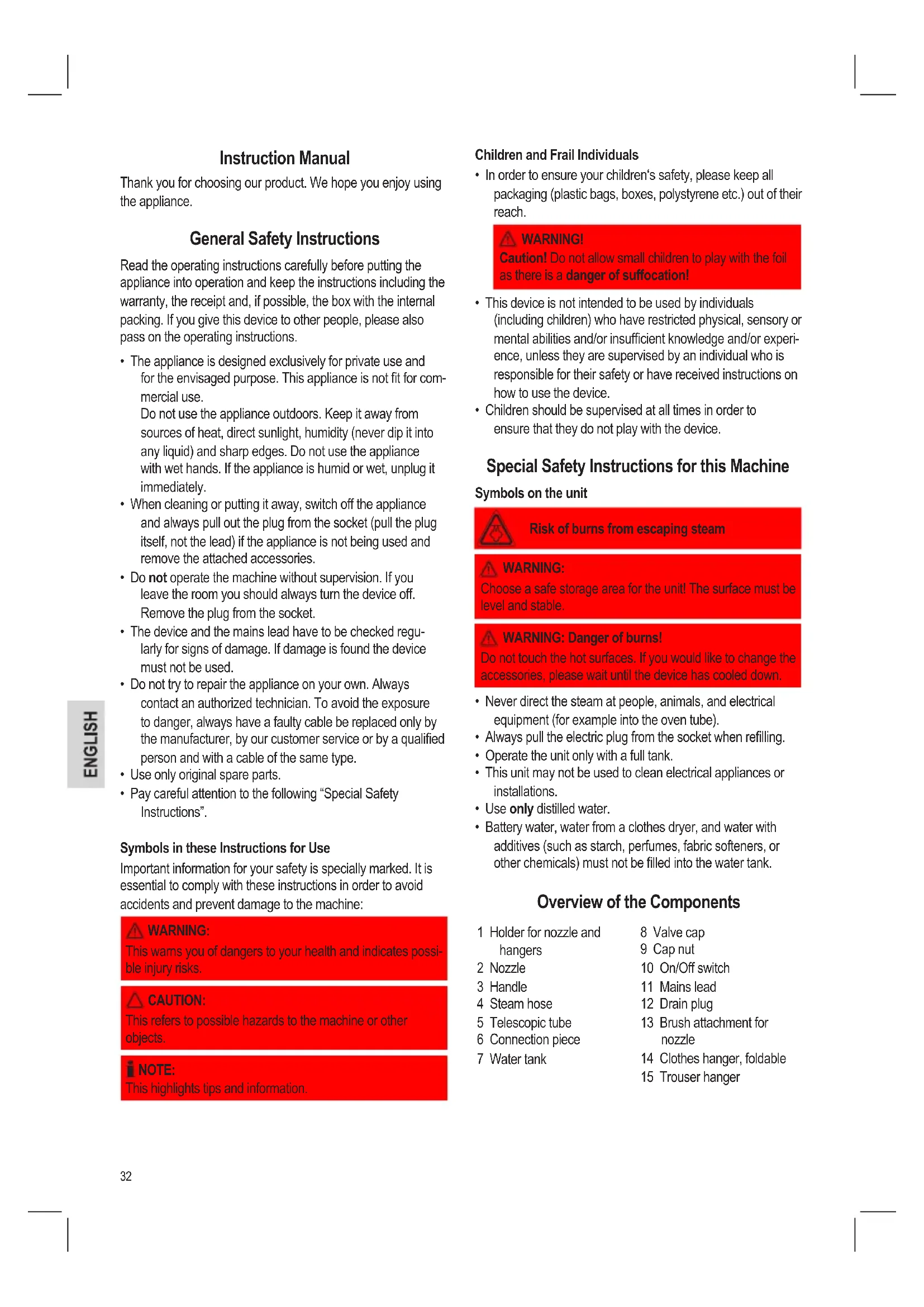 - Battery water, water from a clothes dryer, and water with additives (such as starch, perfumes, fabric softeners, or other chemicals) must not be lled into the water tank. Overview of the Components 1 Holder for nozzle and hangers 2 Nozzle 3 Handle 4 Steam hose 5 Telescopic tube 6 Connection piece 7 Water tank 8 Valve cap 9 Cap nut 10 On/Off switch 11 Mains lead 12 Drain plug 13 Brush attachment for nozzle 14 Clothes hanger, foldable 15 Trouser hanger33 Before First Use Unpacking