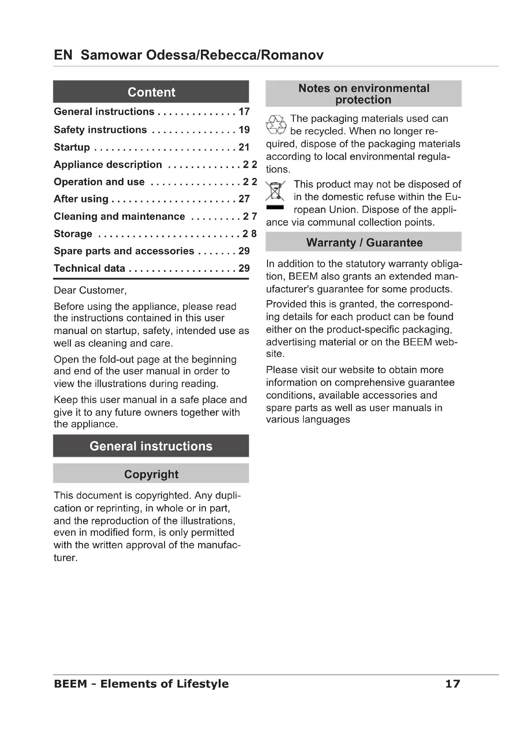 Water temperature ap- prox. 85 °C – 95 °C Water temperature ap- prox. 100° C Operating the dispensing tap (13) Touch mode Press the lever downwards. The dis- pensing tap opens. To close the dis- pensing tap again, release the lever. Continuous operation Push the lever fully downwards. It locks in this position. The dispensing tap opens. To close the dispensing tap again, push the lever upwards. Filling with water The lid (16) of the water tank (15) lies on top of the water tank. To remove the lid, proceed as follows: Switch off the appliance and allow it to cool. Take off the teapot (1). Hold the lid with both lid knobs (5) and lift it off. Fill the tank with fresh water from the tap. WARNING When removing the lid, steam can es- cape and cause scalding! Before removing the lid, allow the ► appliance to cool down. Use pot holders to remove the lid. ► Do not ll the tank over the maxi- ► mum mark. The Samoware Rebecca and Romanov have a locking lid, the Odessa does not. Turn the lid anticlockwise to unlock and remove it (image A). To lock the lid, align the recess on the edge of the lid with the locking pin on the upper edge of the water tank. Put on the lid and turn it clockwise until it stops (image B). A B24 Samowar Odessa/Rebecca/Romanov EN BEEM - Elements of Lifestyle Boiling If you turn the rotary knob (8) clockwise until it stops, the water is boiled quickly. If you leave the switch in this position, the water will continue boiling until it has com- pletely evaporated. Intermittent boiling To boil intermittently after the water has boiled, turn back the rotary knob (8) un- til the blue indicator lamp (9) goes out (approx. a quarter turn in anticlockwise direction). When the temperature of the water drops, the thermostat switches on automatically and reheats the water. The blue indicator light (9) switches on and off according to the thermostat cycle. Relling with water WARNING Filling up a hot tank can cause steam to escape and lead to scalding! Turn the rotary knob (8) anticlockwise ► until it stops. Switch off the appliance. ► Allow the appliance to cool down for a ► few minutes before relling with water. Fill the tank as described in the section Filling with water (page 23). NOTE If you forget to ll with water, the ► boil-dry protection will switch off the heating and the red indicator lamp lights up. Heating water ATTENTION Make sure that the rotary knob (8) is ► turned anticlockwise until it stops. Switch on the appliance as de- ► scribed in the section Switching the appliance on/off (page 22). To heat up water, proceed as follows: Fill the water tank (15) with the desired quantity of fresh water as described in the section Filling with water (page 23). Pay attention the maximum lling level. Close the lid (16) on the water tank (15). The lids on the Samoware Rebecca and Romanov must be locked as described in the section Filling with water (page 23). Subse- quently put the teapot (1) on top. Turn the rotary knob clockwise to the maximum setting ( ). The thermostat allows individual setting of the water temperature. The temperature setting is continuously variable. After the water has boiled, turn back the rotary knob until the indicator blue lamp extinguishes. The temperature of the water will now be kept constant.25 EN Samowar Odessa/Rebecca/Romanov BEEM - Elements of Lifestyle Serving suggestions Brewing tea according to the oriental "Samovar principle" Tea is not just tea. Strictly speaking, tea is only a water infusion of the tea plant ca- mellia sinensis. This infusion can be black or green tea. A distinction must be made between this and tea-like products such as the so-called herbal and fruit teas. Therefore, brewing tea is not always just brewing tea. In order to preserve valuable ingredients and the taste, teas are brewed with water at different temperatures and allowed to steep for different lengths of time. For example, green tea is prefer- ably brewed with water heated to 65° C. In every case, the brewing instructions on the packaging should be observed. Black tea To brew black tea, proceed as follows: Fill the water tank (15) with water. Fill the tea strainer (2) in the teapot (1) with tea leaves (approx. one tea- spoonful per cup) or tea bags (approx. 1 tea bag for approx. 1 – 2 cups). Close the lid (16) of the water tank and subsequently put the teapot on top of it. The teapot is then warmed up at the same time. Boil the water in the water tank (see section Heating water, page 24). Take the teapot off the water tank. NOTE Condensation may drip off the bot- ► tom of the teapot. Pour boiling water from the water tank over the tea. NOTE The more tea leaves or tea bags and ► the less water you ll into the teapot, the stronger the tea concentrate will be (professionals enjoy an infusion with approx. 3 g for 200 ml of water). It is preferable to use slightly more tea so that a real concentrate is produced in the teapot. Place the teapot with the tea con- centrate on the water tank again. The steam rising from the water tank keeps the tea in the teapot at exactly the temperature it needs to "steep". After the required brewing time, take the tea strainer (2) with the tea leaves out of the teapot. Pour the tea concentrate from the teapot into your glass and top up with water from the water tank. This allows you to adjust the strength and taste of your tea. You can leave the teapot standing on the water tank while the appliance is in operation so that you can add hot tea and hot water at any time. Turn the rotary knob to intermittent boiling (see section Intermittent boil- ing, page 24) so that the water re- mains hot but does not boil constantly. The thermostat cycle switches the blue indicator light on and off.26 Samowar Odessa/Rebecca/Romanov EN BEEM - Elements of Lifestyle Green tea Green tea can also be brewed in the Samovar. It should not normally be infused with boiling water since it may then taste slightly bitter. Depending on the type,