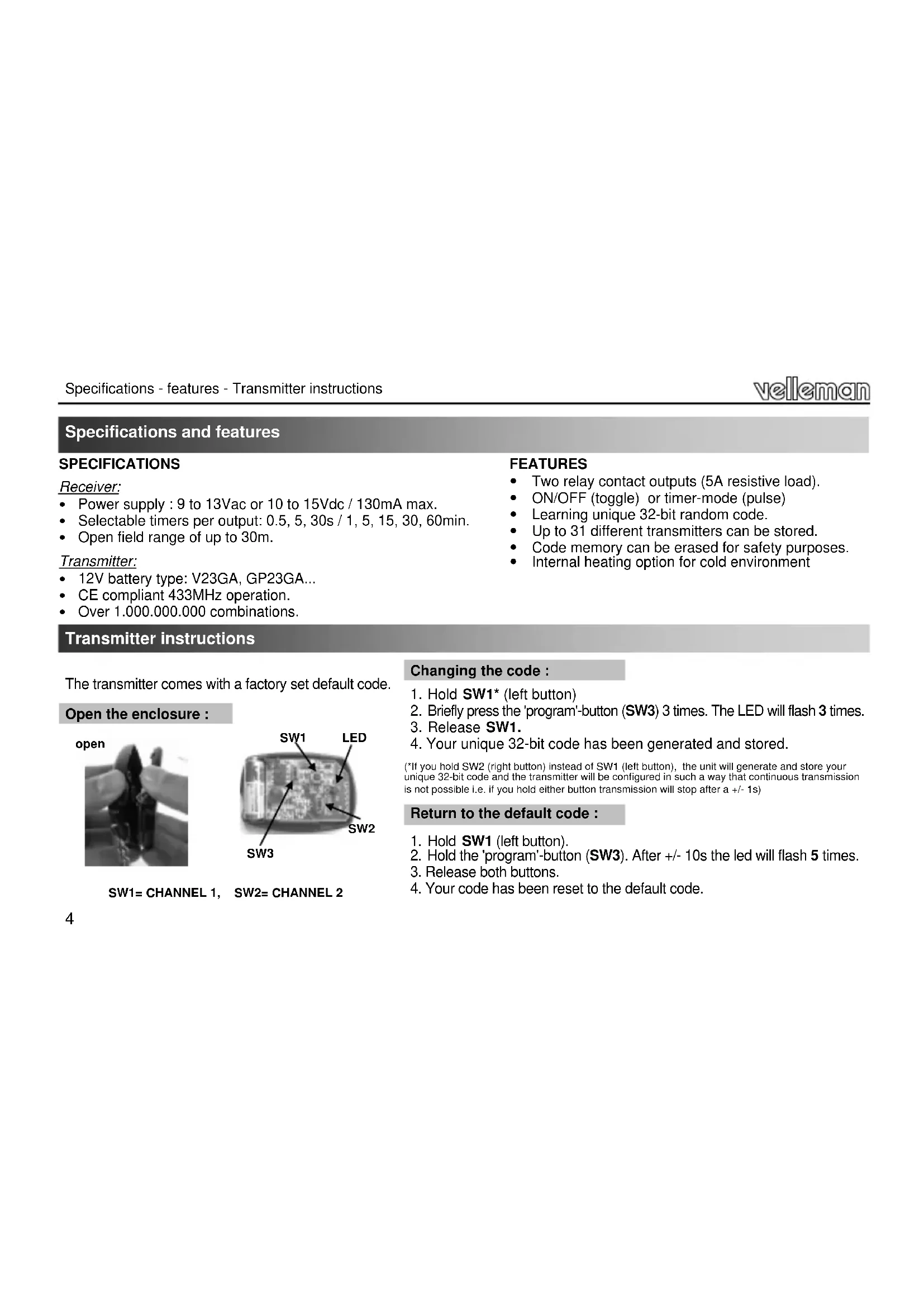The left remote button controls CH1 relay, the right remote button controls CH2 relay. Each relay is equipped with a status LED. In ‘0.5s timer’-mode, a relay will remain on for as long as the remote button is held. If a timer has been set for a particular channel, the relay will turn on when the button is pushed. When the preset time has elapsed, the relay will turn off. A timer can be turned off at any time by pressing the transmitter button again. As long as the timer is running, the corresponding led will flash. In ‘ON-OFF’-mode, the relay will toggle between ON and OFF every time a button is pushed. IMPORTANT: To minimise the idle current, remove the heating jumper if the unit is used inside a car. Use : WARRANTY This product is guaranteed against defects in components and construction from the moment it is purchased and for a period of TWO YEAR starting from the date of sale. This guarantee is only valid if the unit is submitted together with the original purchase invoice. VELLEMAN components Ltd limits its responsibility to the reparation of defects or, as VELLEMAN components Ltd deems necessary, to the replacement or reparation of defective components. Costs and risks connected to the transport, removal or placement of the product, or any other costs directly or indirectly connected to the repair, will not be reimbursed by VELLEMAN components Ltd. VELLEMAN components Ltd will not be held responsible for any damages caused by the malfunctioning of a unit. VM130G'1_rev3.pub page 6 Friday, January 25, 2013 11:087 Eigenschappen - technische gegevens - Zender instructies Eigenschappen & technische gegevens EIGENSCHAPPEN 2 relaisuitgangen met omschakelcontact (5A resistieve last). AAN/UIT (toggle) of timer-mode (pulse) instelbaar per uitgang. Kan unieke 32-bit code leren. Sla max. 31 zenders op. Codegeheugen kan worden gewist om veiligheidsredenen Interne verwarmingsoptie voor gebruik in koude omgevingen. De zender heeft een voorgeprogrammeerde standaardcode