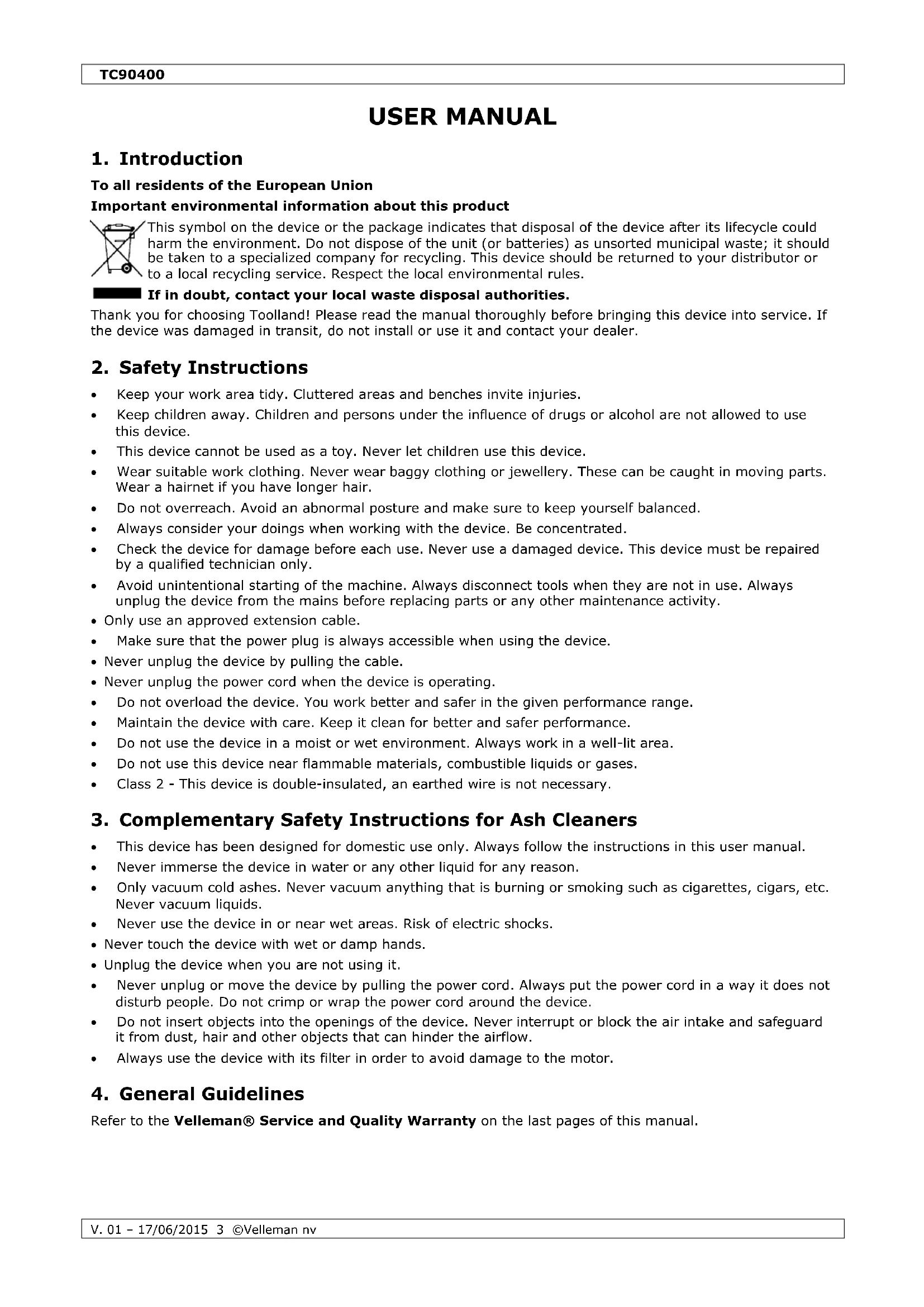 Download the instructions for your Vacuum Cleaner in PDF format for free! Find your manual TC90400 - Toolland and take your electronic device back in hand. On this page are published all the documents necessary for the use of your device. TC90400 by Toolland.
