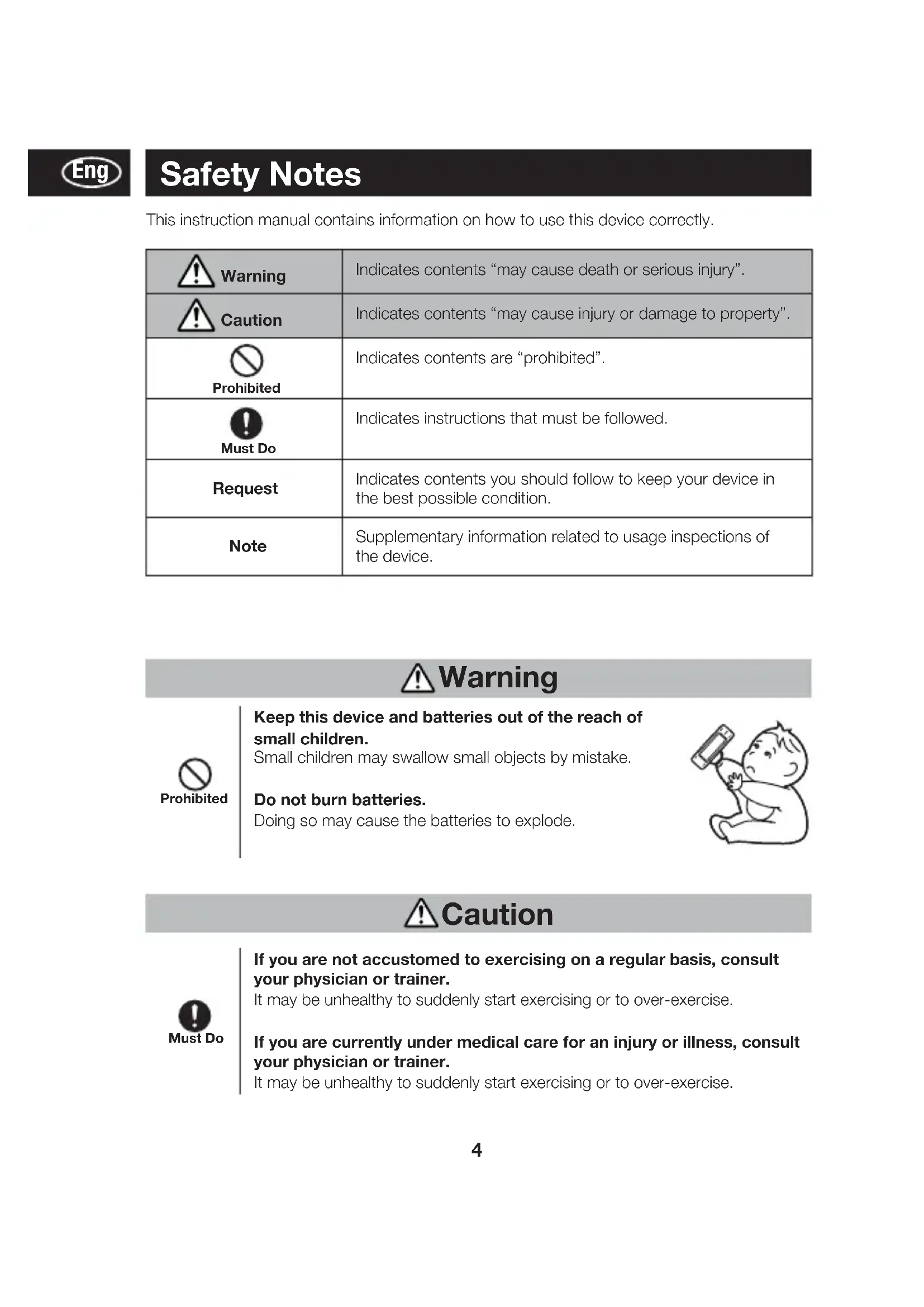 the system reset. Note: The display screen switches to the setting screen after system reset. Refer to page 11, and reset the initial settings. Note: If you do not wish to reset the system, select [No] and press the SET button. The display screen returns to the setting screen.30 Eng Specifications Detection Method Triaxial Acceleration Sensor Display Method LCD Display Setting Contents Time 24-Hour Display Age 6–99 years old Sex Male/Female Height 90 cm–220 cm Weight 20 kg–150 kg Body Fat Percentage 5.0%–75.0% Stride Width 20 cm–150 cm Display Contents Number of Steps Min: 1 step Max: 99999 steps Time 24-Hour Display Distance Min: 0.01 km Max: 149.99 km Walking Time Min: 1 min Max: 1440 mins Total Energy Expenditure Min: 1 kcal Max: 99999 kcal Basal Metabolic Rate Min: 1 kcal Max: 9999 kcal Activity-related Energy Expenditure Min: 0.1 kcal Max: 9999.9 kcal METs Min: 1.0 Max: 18.0 METs 24-Hour Activity Graph Min: 1 Scale mark Max: 7 Scale marks Shows the amount of activity for each hour 7-Day Shows the total energy expenditure, resting energy expenditure, active energy, number of steps, distance, walking time and 24-hour Activity graph for the last 7 days Accuracy of Number of Steps ±5% (depending on vibration testing machine) Clock accuracy Within ±30 seconds of the average month Power Supply DC 3.0 V (two CR2032 batteries) Battery Life Approx. 9 months (when used for approximately 16 hours per day) Temperature Range 0 – +40 °C Dimensions D13 x W30 x H88 mm31 Eng Weight Approx. 32 g (including batteries) Main Materials Device body: ABS Clear Lens: PMMA Country of Manufacture China32 Eng Troubleshooting The mark is flashing The battery power is low. Replace them promptly with new batteries (CR2032). Refer to P. 8. is displayed There is no battery power. Measurements cannot be taken. Replace with new batteries (CR2032). Refer to P. 8. Batteries are fitted but nothing is displayed Are the batteries positioned correctly? Check the and sides of the batteries. Refer to P. 10. The batteries have run down. Replace them promptly with new batteries (CR2032). Refer to P. 8. The measured value is too small/large Is the device attached correctly? Refer to P. 18. Are the settings correct? Check the contents of the settings. Refer to P. 11. Refer to “Using the Daily Activity Monitor Correctly” on P. 21 to ensure you are using the device correctly. mark is displayed Re-insert the batteries. Refer to P. 8. If there are problems with the past memory after re-inserting the batteries, reset the system. Refer to P. 29. Not allowed to mix batteries with consumer wastes! As consumer you are legally bound to return used or discharged batteries. You can deposit your old batteries at the public collecting points in your town, or wherever the corresponding batteries are sold and specifically marked collecting boxes have been set up. In case of scrapping the apparatus, the batteries should be removed from it and deposited at the collecting points as well. Notice: These marks can be found out on contaminant-containing Batteries: Pb Pb = Battery contains lead, Cd Cd = Battery contains cadmium, Hg Hg = Battery contains mercury. The device features radio interference suppression in compliance with EC regulation 2004/108/EC33