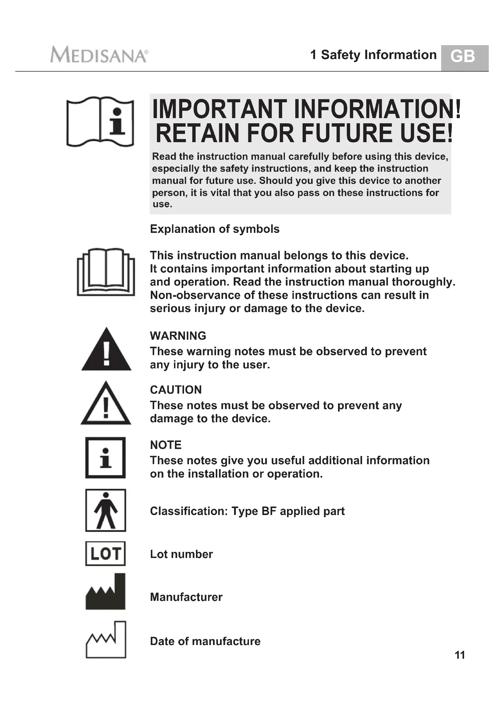 The device complies with the EN 60601-1-2 (2001) standard for electromagnetic compatibility. You can find details on this measurement data on the MEDISANA homepage www.medisana.com.