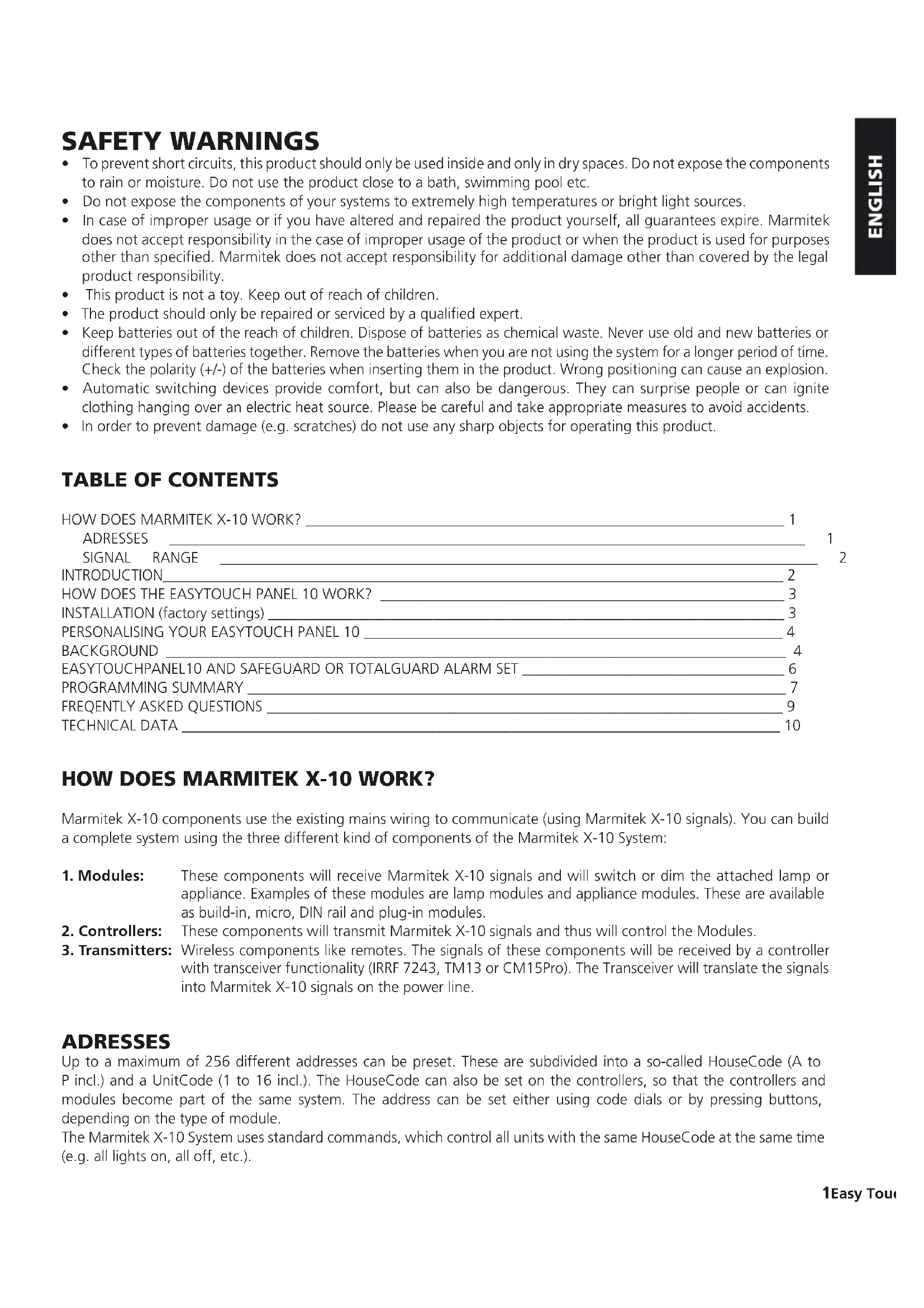 Congratulations on the purchase of the Marmitek EasyTouch Panel 10! You can use this touch-screen control panel to easily operate all your Marmitek X-10 modules. You can use the background supplied to immediately try out the EasyTouch Panel 10's standard functions. If preferred, this background can be replaced by a photograph or image of your choice. You can then install the panel in or on the wall. In this way, the control panel becomes personalised and the Marmitek EasyTouch Panel 10 is suitable for every interior! You do not need a computer to programme the EasyTouch Panel 10.