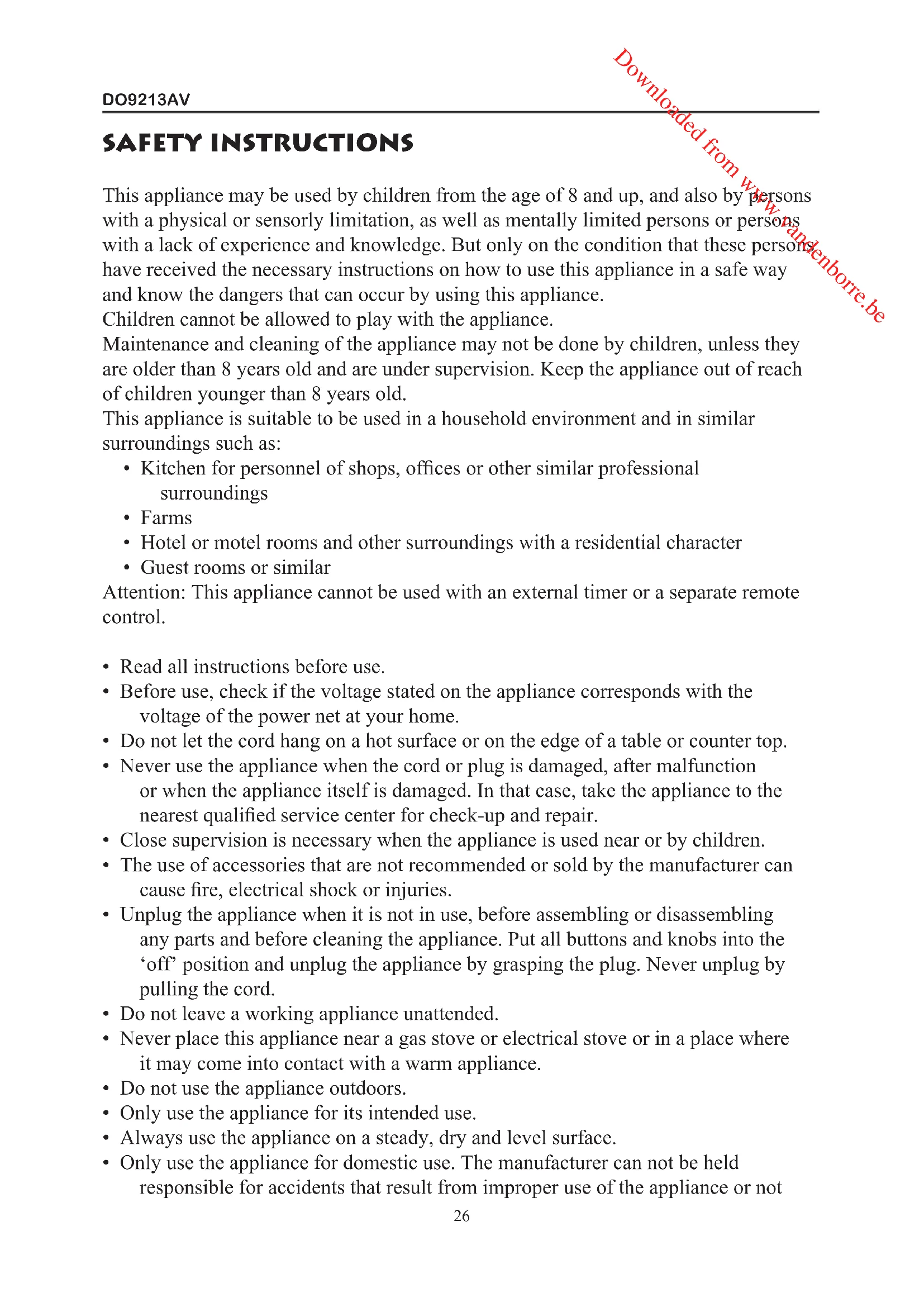 - Only use the appliance for domestic use. The manufacturer can not be held responsible for accidents that result from improper use of the appliance or not
