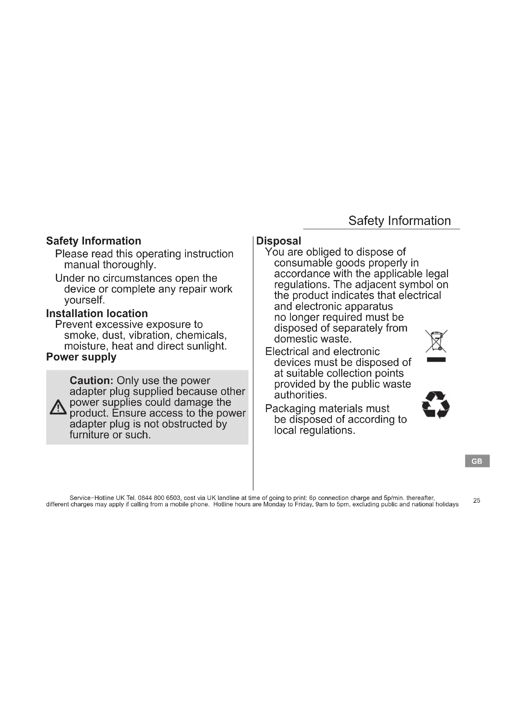 Service−Hotline UK Tel. 0844 800 6503, cost via UK landline at time of going to print: 6p connection charge and 5p/min. thereafter, different charges may apply if calling from a mobile phone. Hotline hours are Monday to Friday, 9am to 5pm, excluding public and national holidays Caution: Only use the power adapter plug supplied because other power supplies could damage the product Ensure access to the power adapter plug is not obstructed by furniture or suchGB